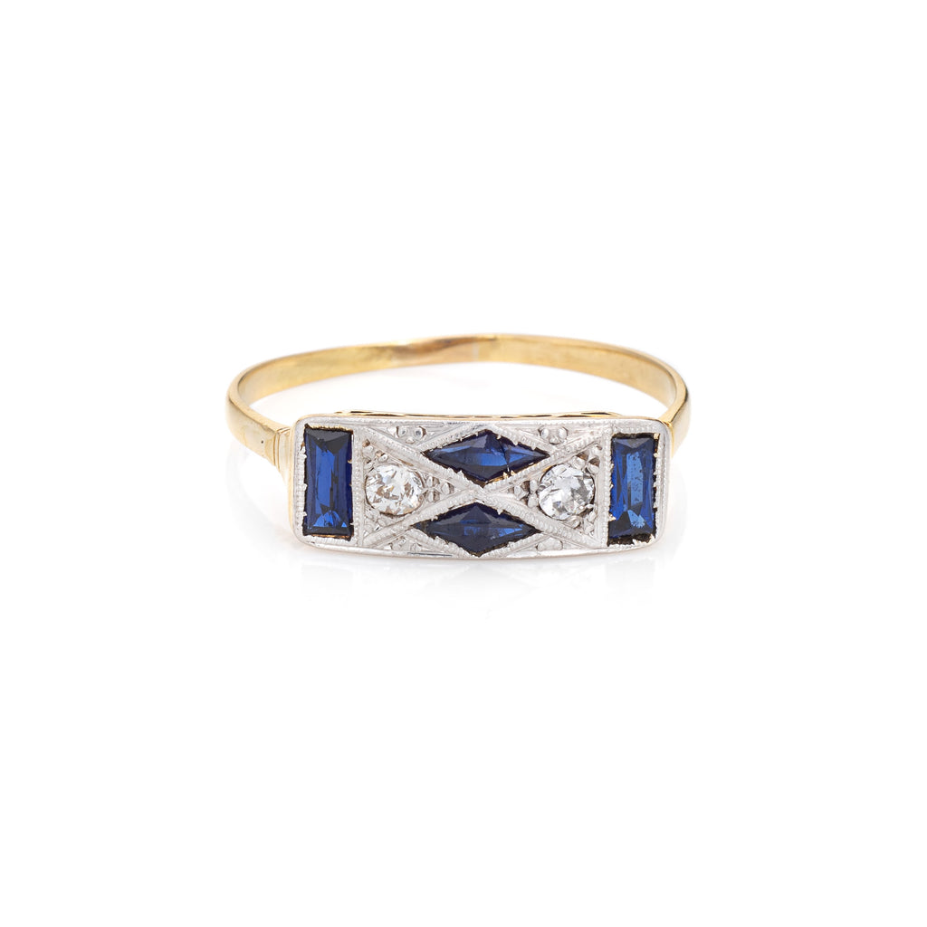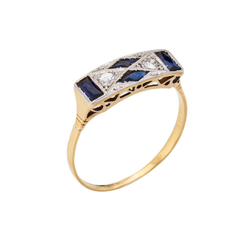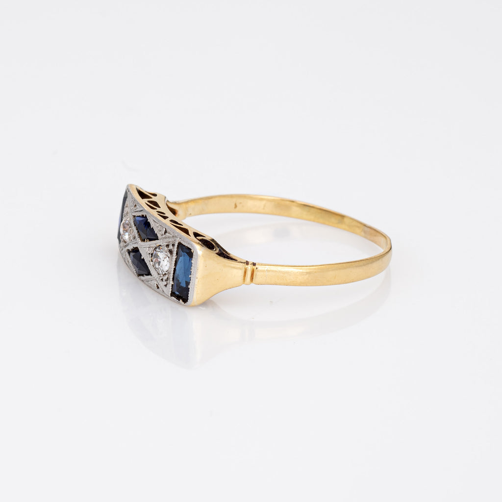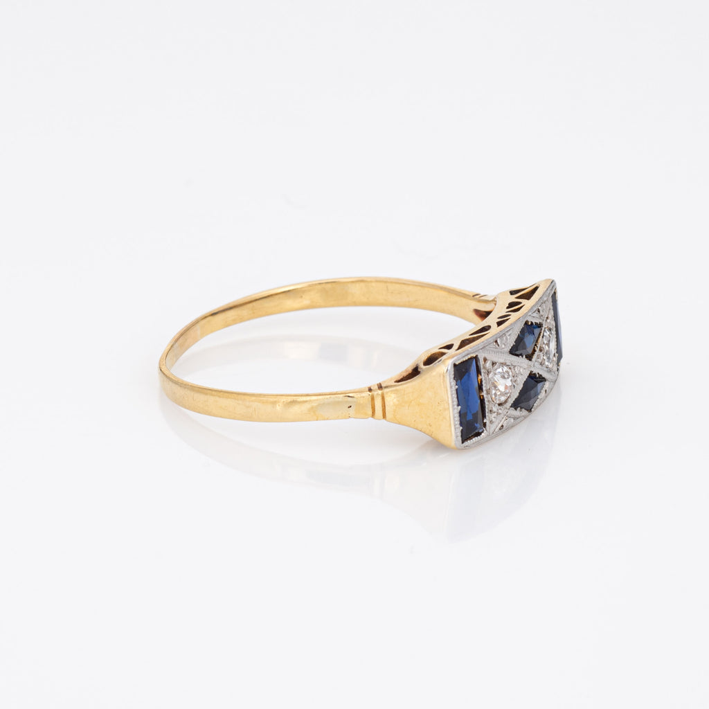 Finely detailed vintage Art Deco diamond & sapphire ring (circa 1920s to 1930s) crafted in 18k yellow gold & platinum.