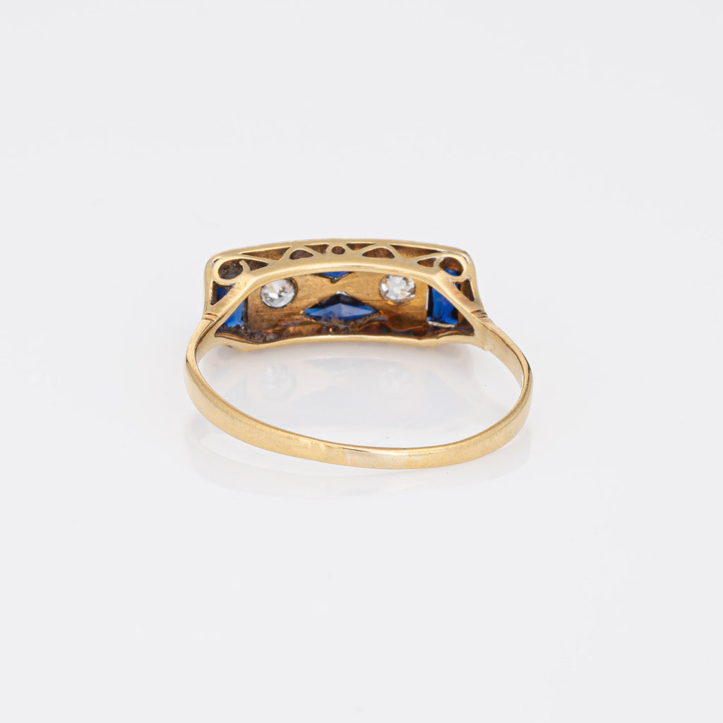 Four French cut sapphires (lab) range in size from 0.05 to 0.10 carats. Old mine and European cut diamonds total an estimated 0.10 carats (estimated at I-J color and SI1-2 clarity). Note: light surface abrasions to the lab sapphires (visible under a 10x loupe)