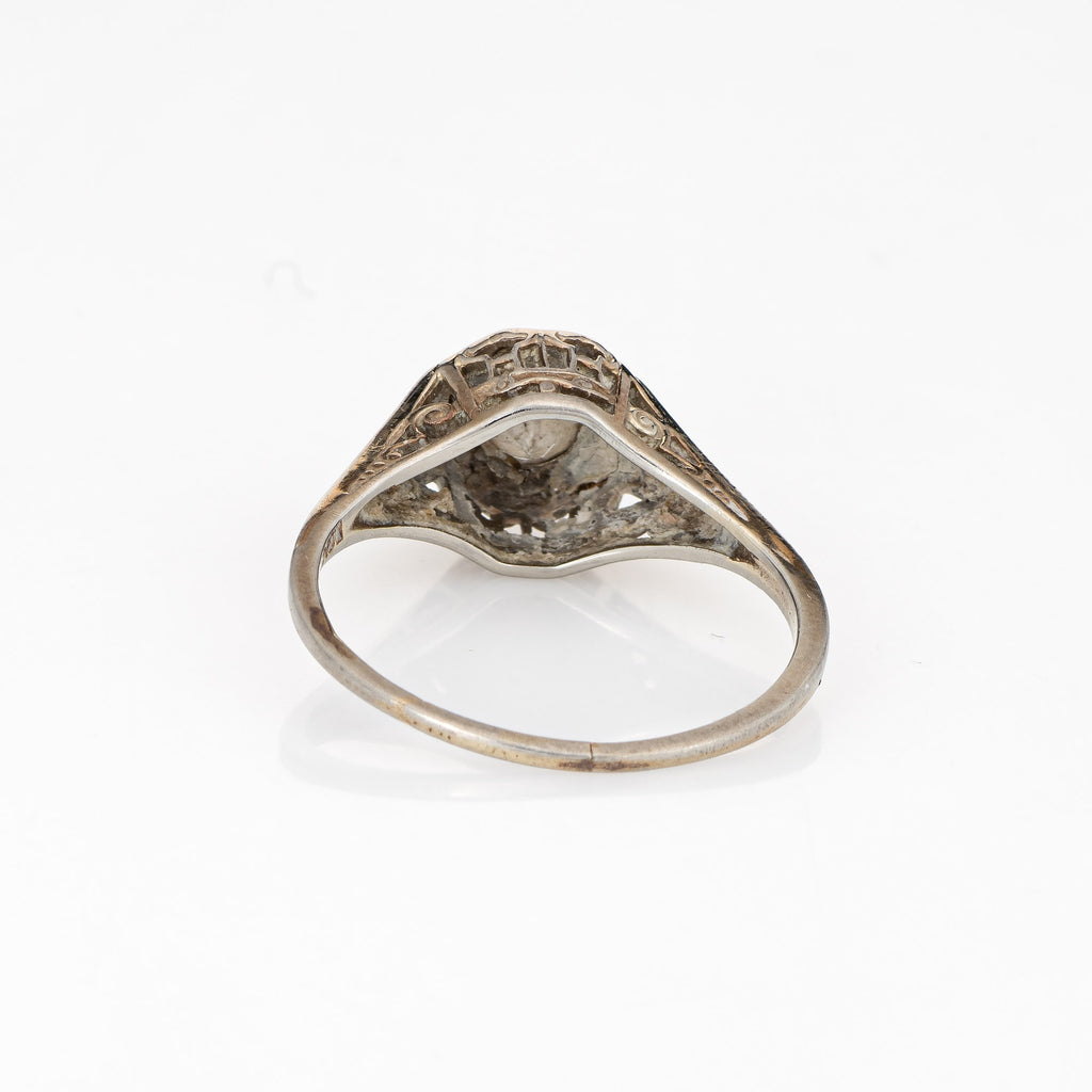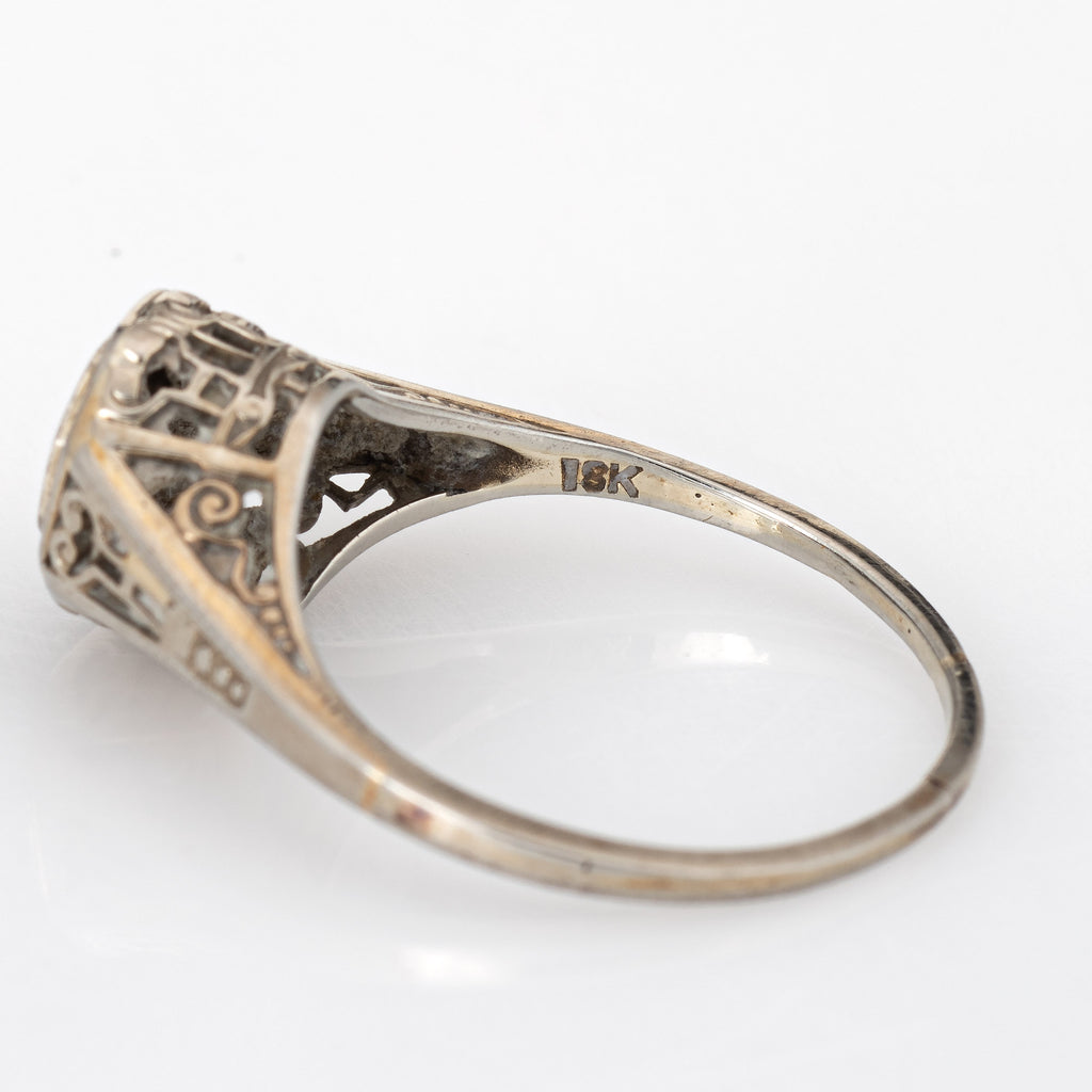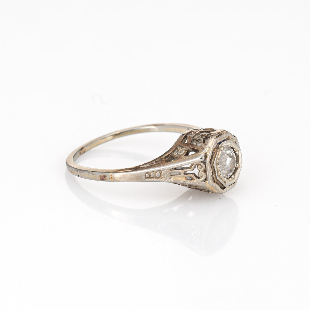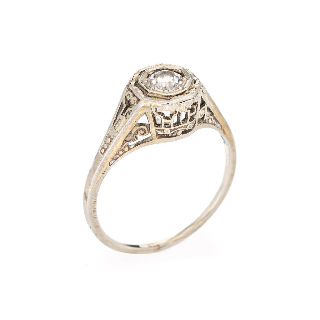 The old European cut diamond is set into an octagonal mount. A scrolled filigree pattern decorates the under gallery. The ring would make a lovely engagement or right hand ring. The ring has a medium profile and rises 6mm from the finger (0.23 inches).