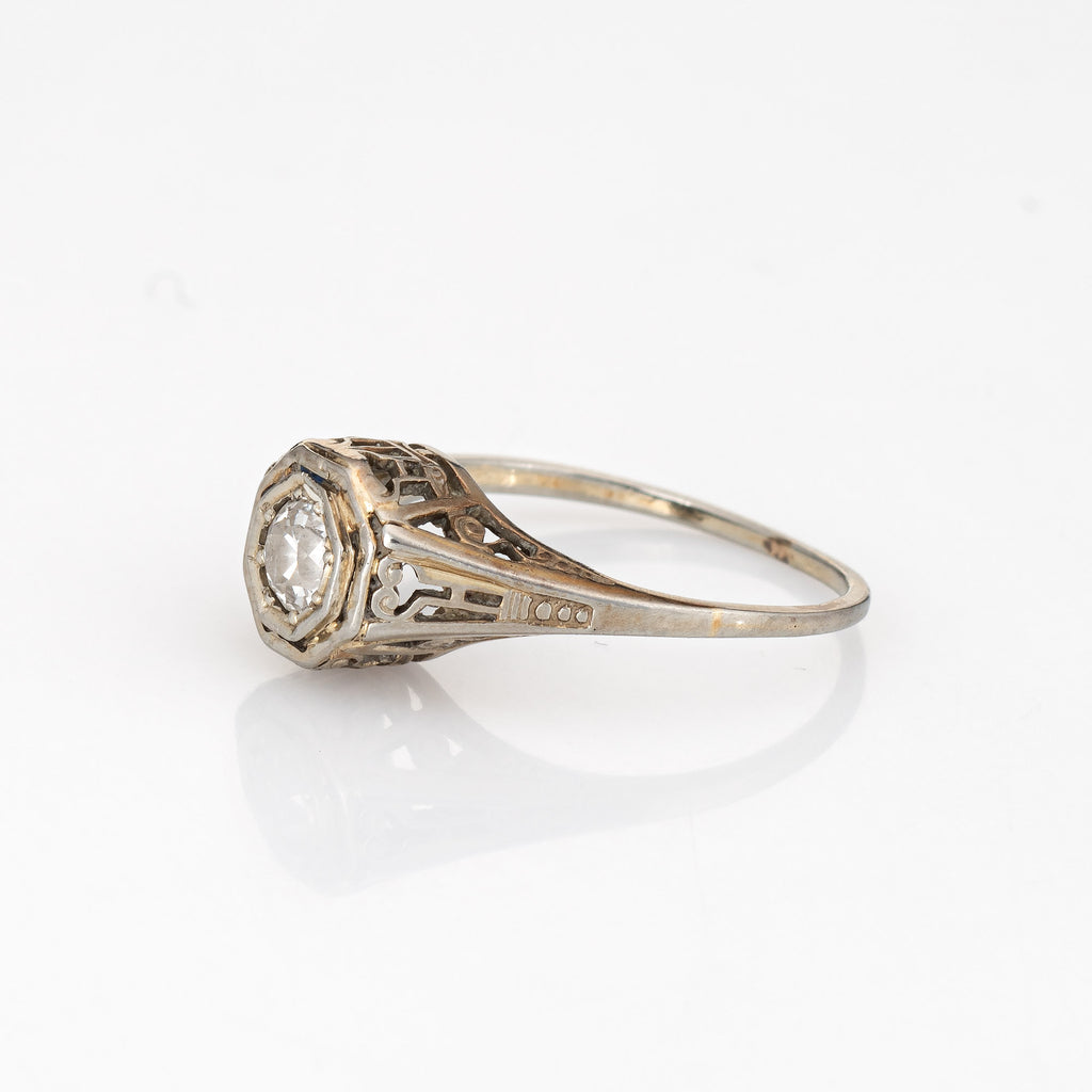 Finely detailed vintage Art Deco diamond engagement ring (circa 1920s to 1930s) crafted in 18 karat white gold.