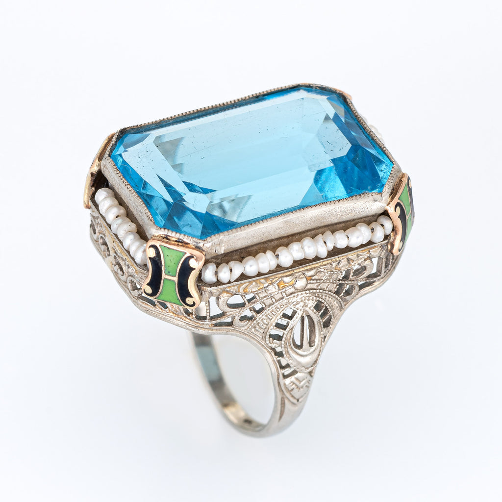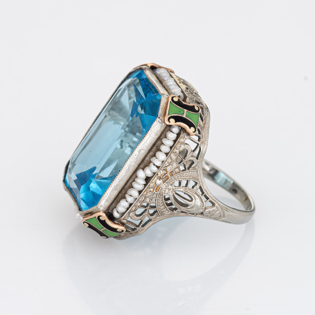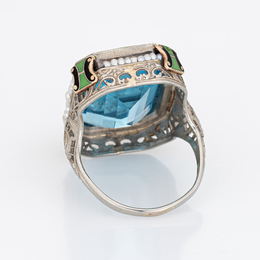 Vintage Art Deco era blue topaz & seed pearl enamel cocktail ring (circa 1920s to 1930s) crafted in 10 karat white gold.