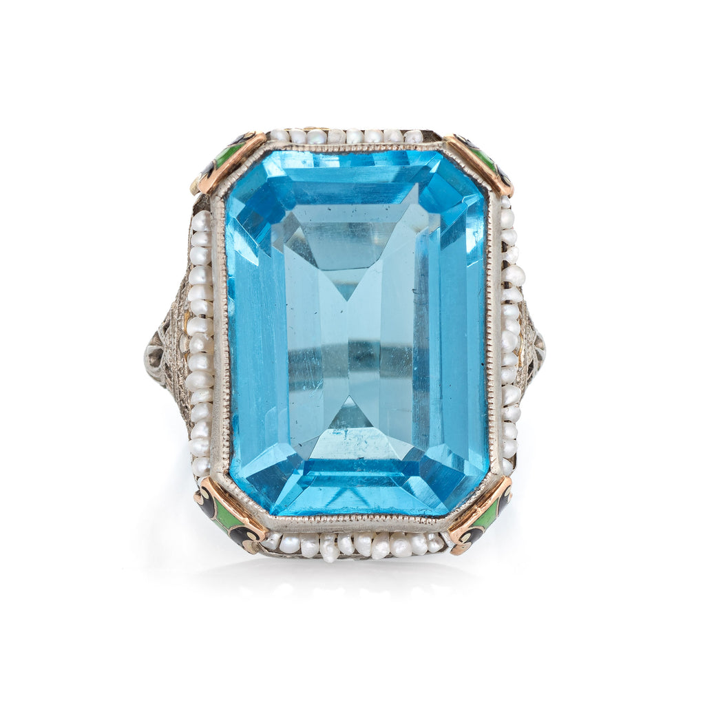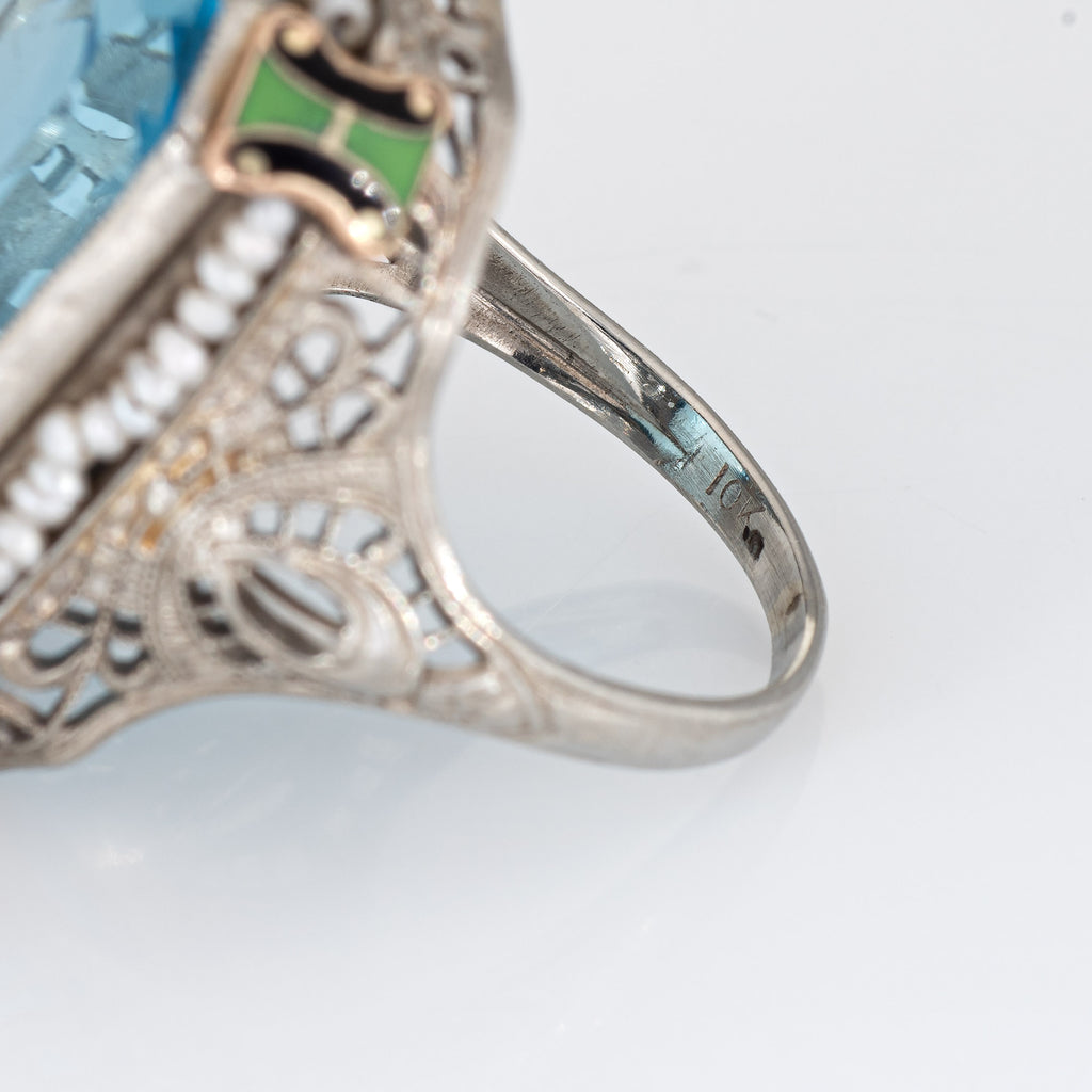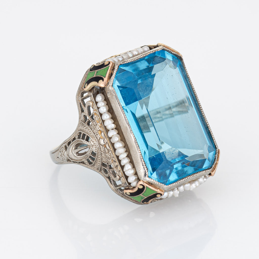 Vintage Art Deco era blue topaz & seed pearl enamel cocktail ring (circa 1920s to 1930s) crafted in 10 karat white gold.