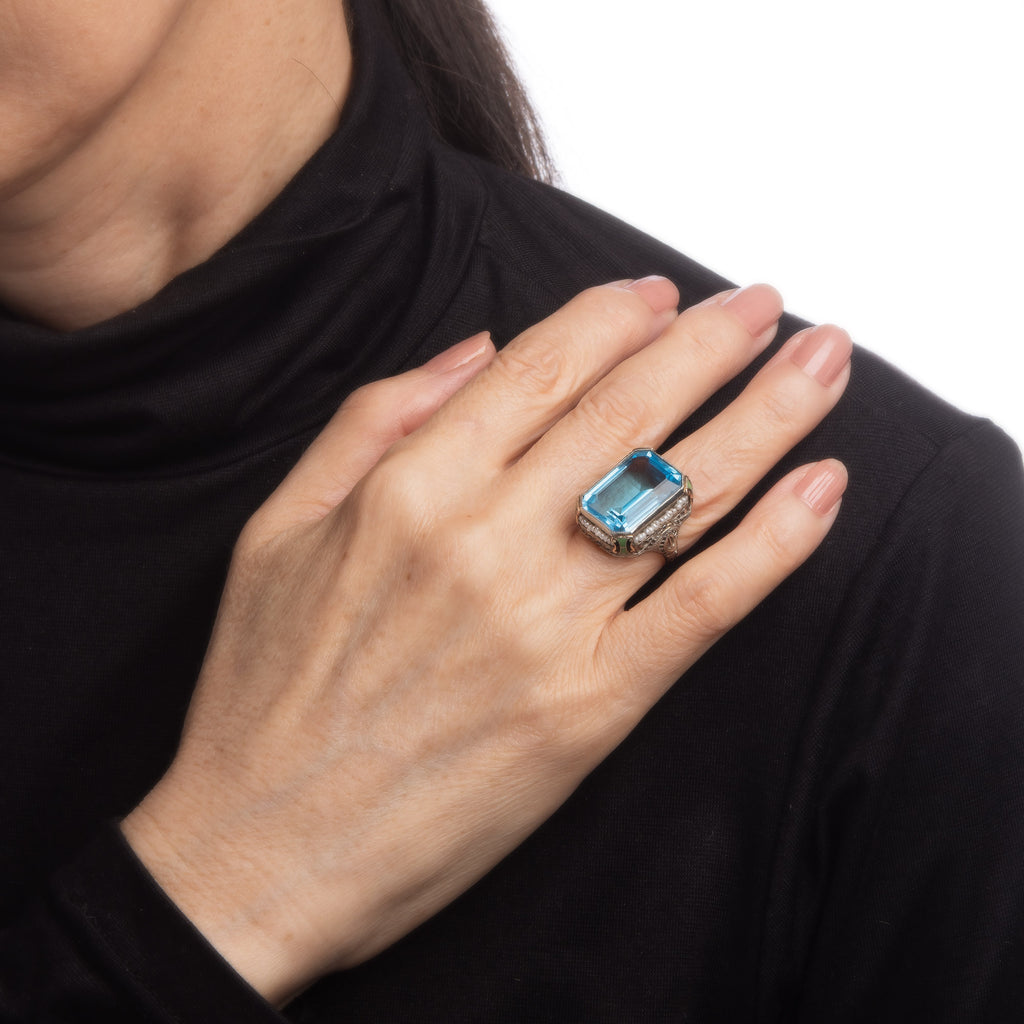 The ring makes a great statement on the hand. With a lacy filigree undergallery, the vibrant swiss blue topaz is framed with small seed pearls. Colorful green and black enameled shoulder points are a hallmark of the Art Deco era, adding a splash of color to the ring. The medium rise ring (8mm - 0.31 inches) sits comfortably on the finger. The ring is in good condition with minor wear evident.