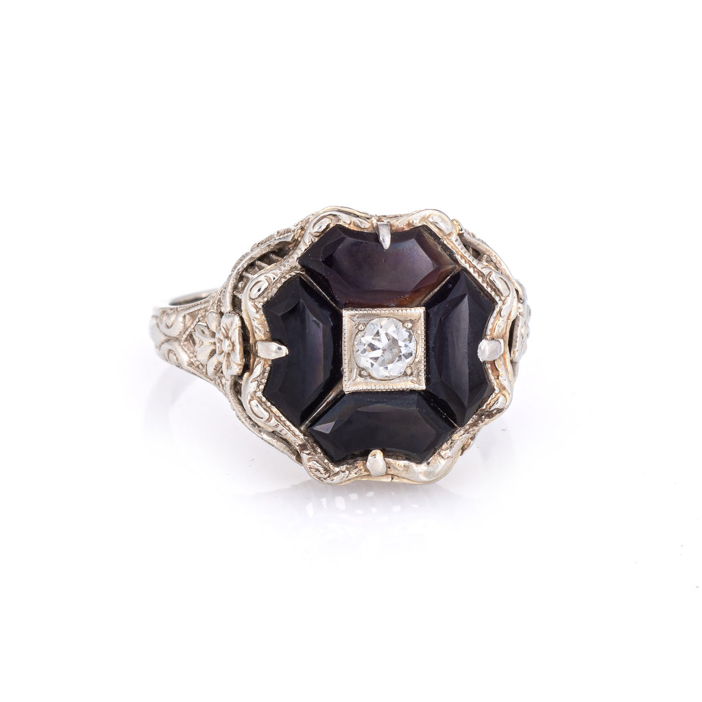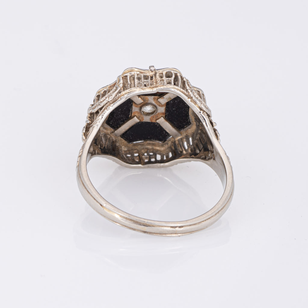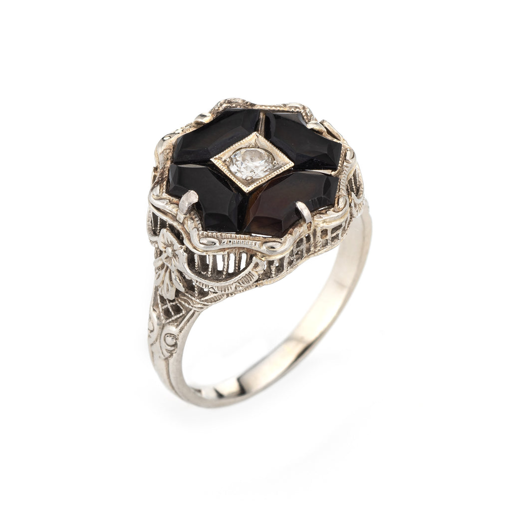 Vintage Art Deco Onyx Diamond Ring 14k White Gold Filigree Estate Jewelry Sz 6