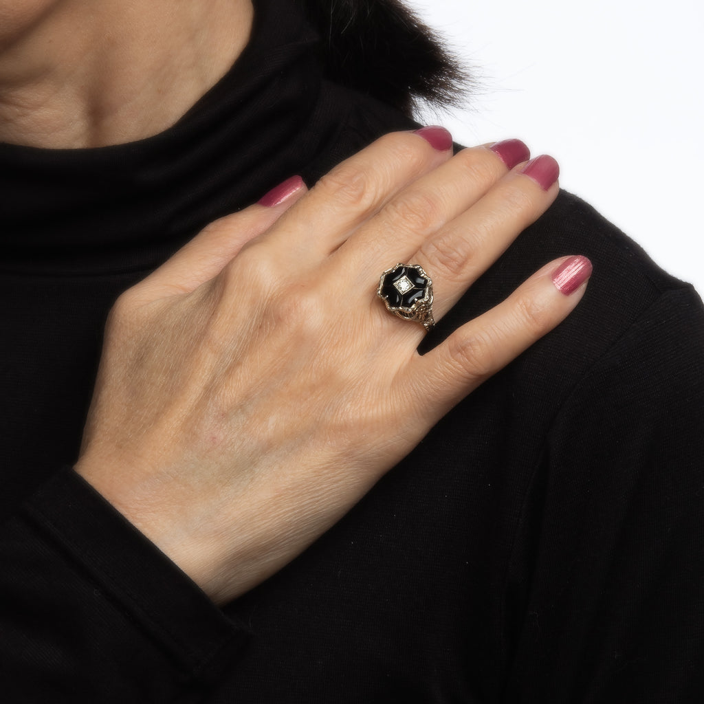Center set estimated 0.10 carat old European cut diamond (estimated at I-J color and I1 clarity) is accented with onyx measuring 6mm x 3mm. The onyx is in very good condition and free of cracks or chips.
