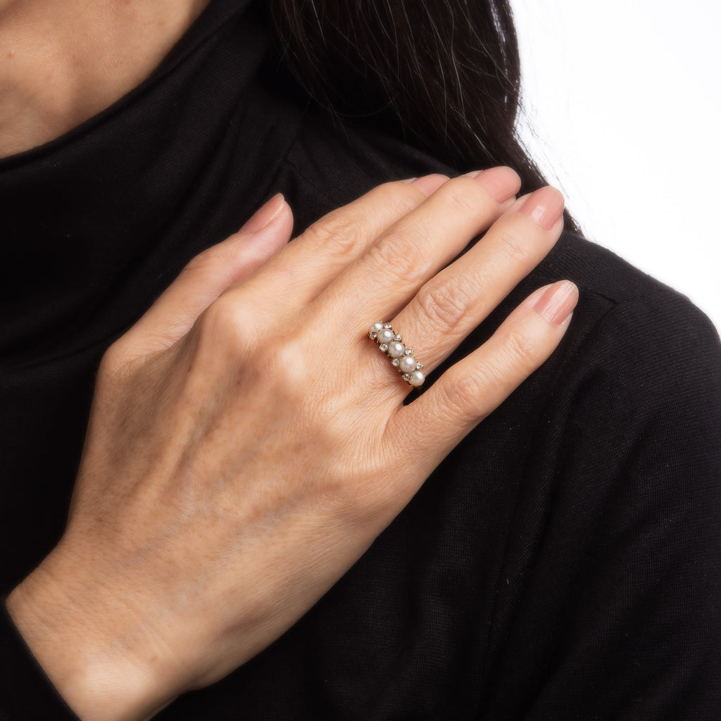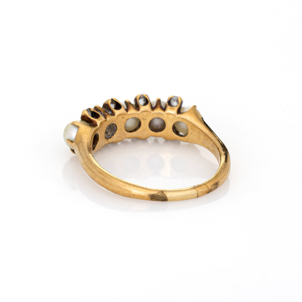 Stones: 8 old single cut diamonds total an estimated 0.08 carats (estimated at H-I color and SI1-I2 clarity). Five cultured pearls measure 3mm. The pearls are well matching, uniform in size and lustrous.