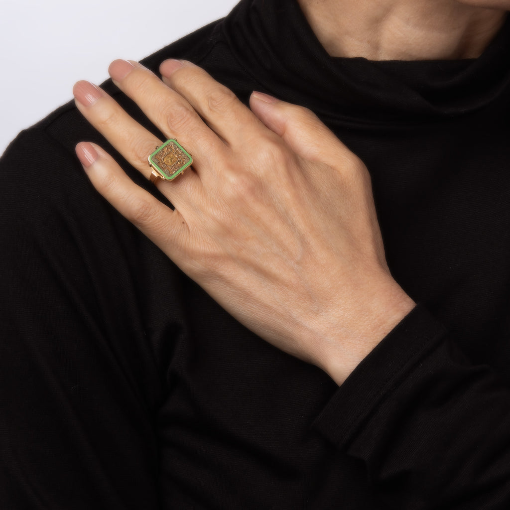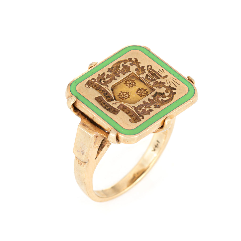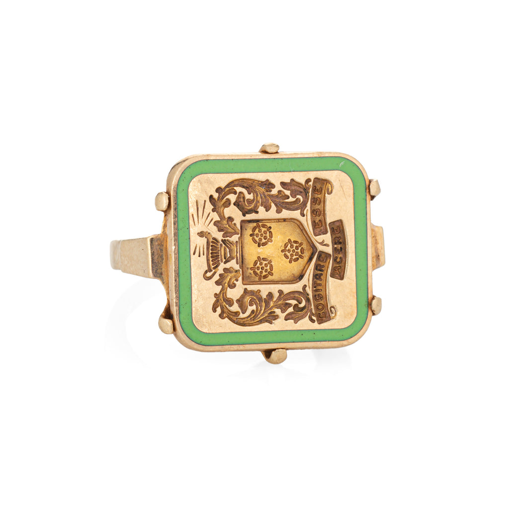 The elaborate signet mount, framed with green enamel, features a foliate motif with possibly an urn or decorative pot to the top (with a flame as if to illuminate the scene). The base of the signet mount reads in Latin the phrase 'cogitare esse acere' or roughly translates to 'Think to be better'. The low rise ring (8mm - 0.31 inches) sits comfortably on the finger.