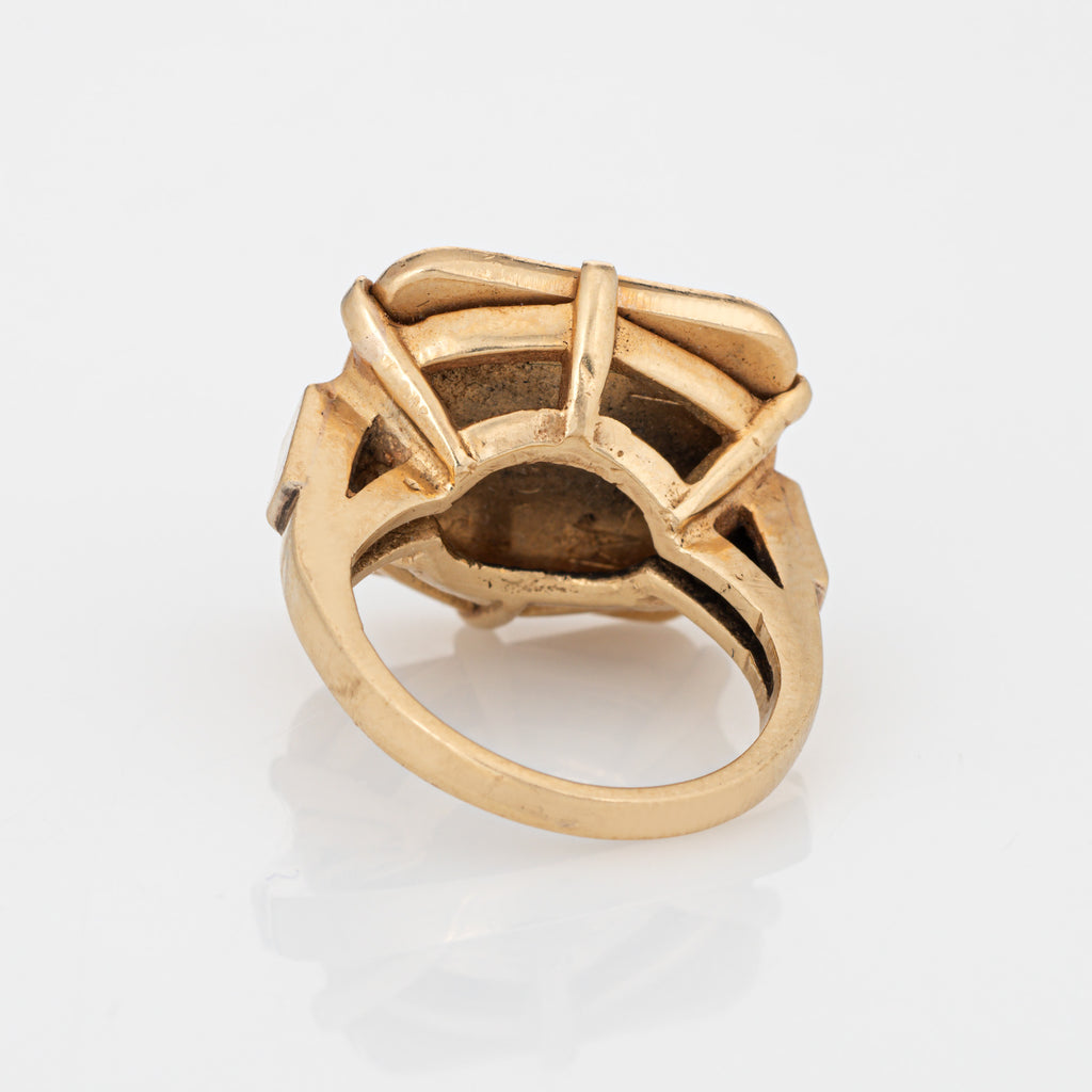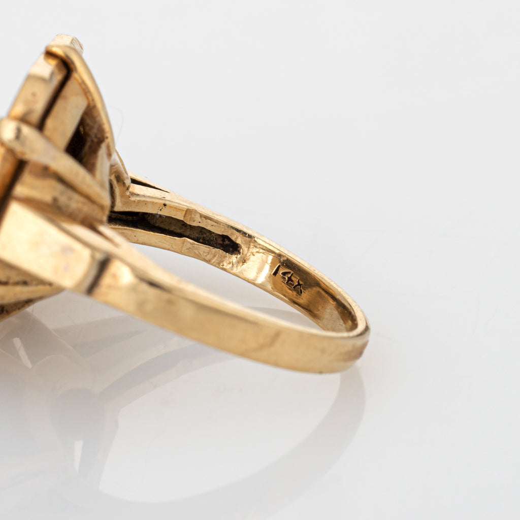 Metal & Hallmark: 14 karat yellow gold. The ring is hallmarked "14k"