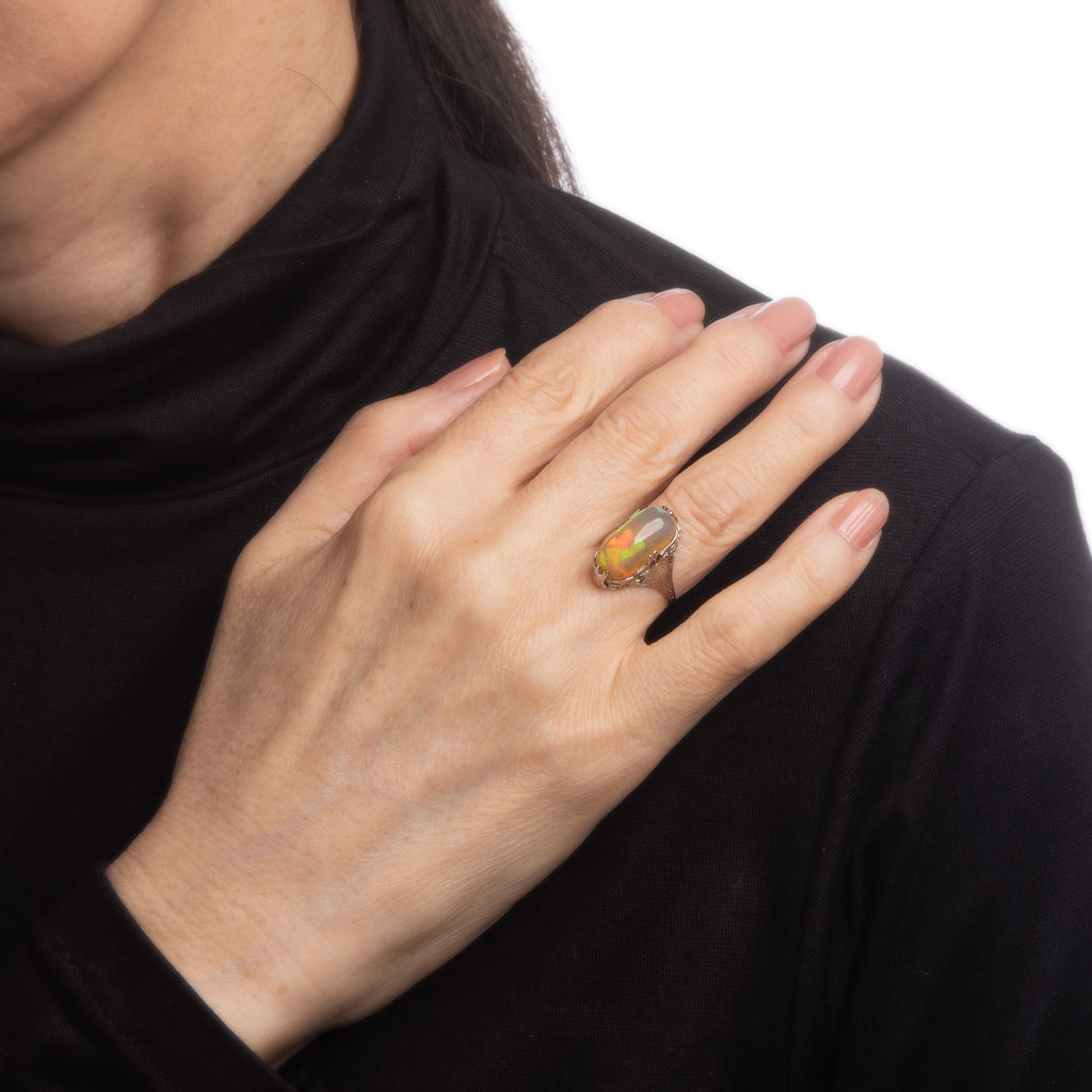 Stones: Cabochon cut Ethiopian opal measures 15mm x 8.5mm (estimated at 4.50 carats). The opal is in very good condition and free of cracks or chips.