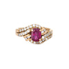 Oval faceted ruby is estimated at 0.90 carats. 30 round brilliant cut diamonds total an estimated 0.30 carats (estimated at I-J color and SI2-I2 clarity). The ruby is in good condition with light surface abrasions visible under a 10x loupe.