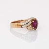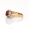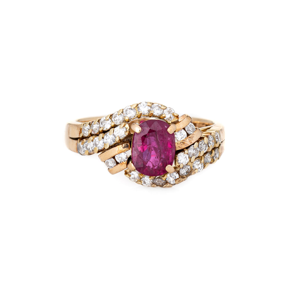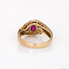 Stylish vintage ruby & diamond ring (circa 1970s to 1980s) crafted in 14 karat yellow gold.