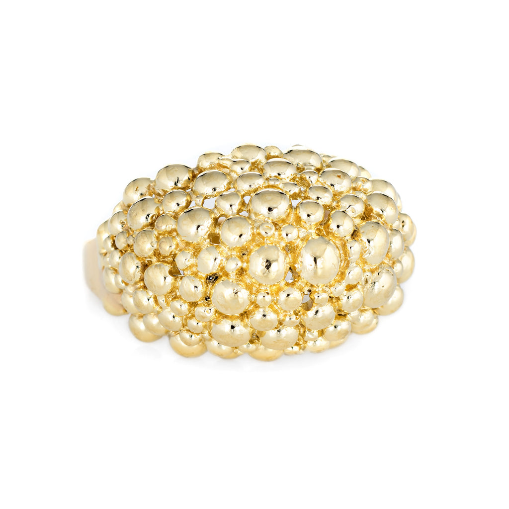 The ornate ring features a textured domed mount that resembles bubbles in various sizes and forms. The rich buttery gold adds a nice pop of color on the hand. The medium rise ring (9.7mm - 0.38 inches) sits comfortably on the finger. The colorful ring is impactful in design and ideal worn day or night.
