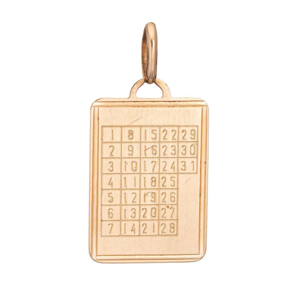 Vintage Calendar Date Charm 14k Yellow Gold Pendant 1 to 31 Days Square Numbers