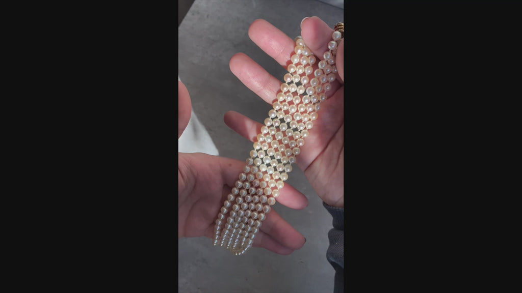 Stones: Cultured pearls are uniform in size and measure 6mm, strung onto three strands. The pearls are lustrous with a thick nacre and exhibit a rose overtone.