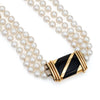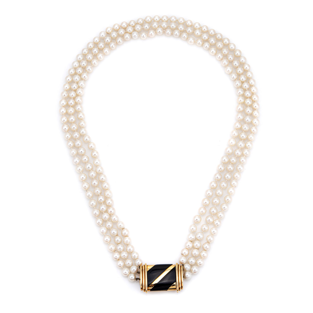 Stylish vintage Cartier triple stand cultured pearl necklace (circa 1960s to 1970s) finished with an 18k gold onyx inlaid clasp.