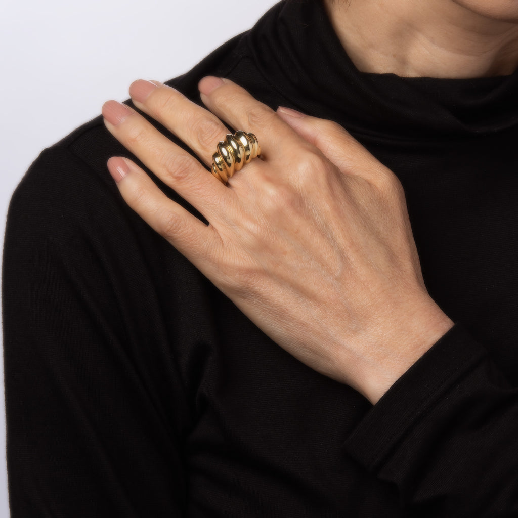 The Cartier ring features a ridged or fluted design, rising 9mm from the finger (0.35 inches). The ring makes a statement on the hand and is great worn alone or layered with your fine jewelry from any era.