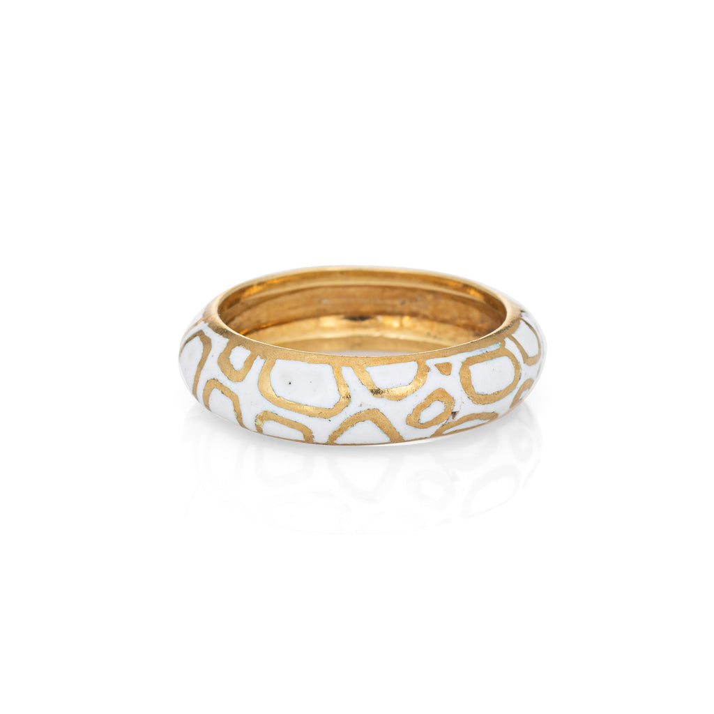 The Cartier ring features an abstract white enamel pattern around the entire band. The band measures 5mm wide (0.19 inches). The ring is great worn alone or layered with your fine jewelry from any era.