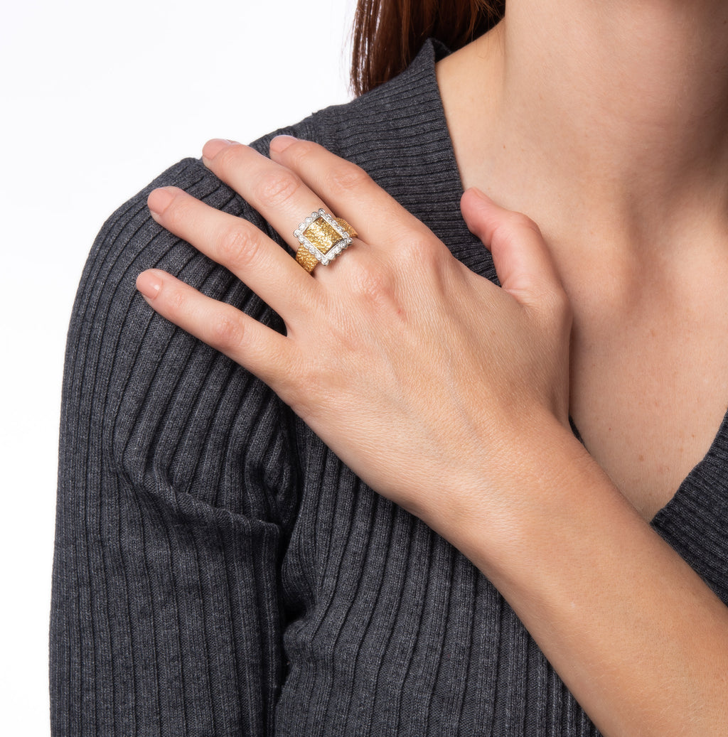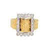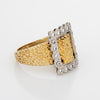 The stylish buckle ring is set with diamonds to the square buckle motif. Currently a size 9 (can be resized) the ring is great worn alone or stacked with your fine jewelry from any era. The buckle motif represents the joining of two lives together. The low ring rise ring (4.5mm - 0.17 inches) sits flat and comfortably on the finger.