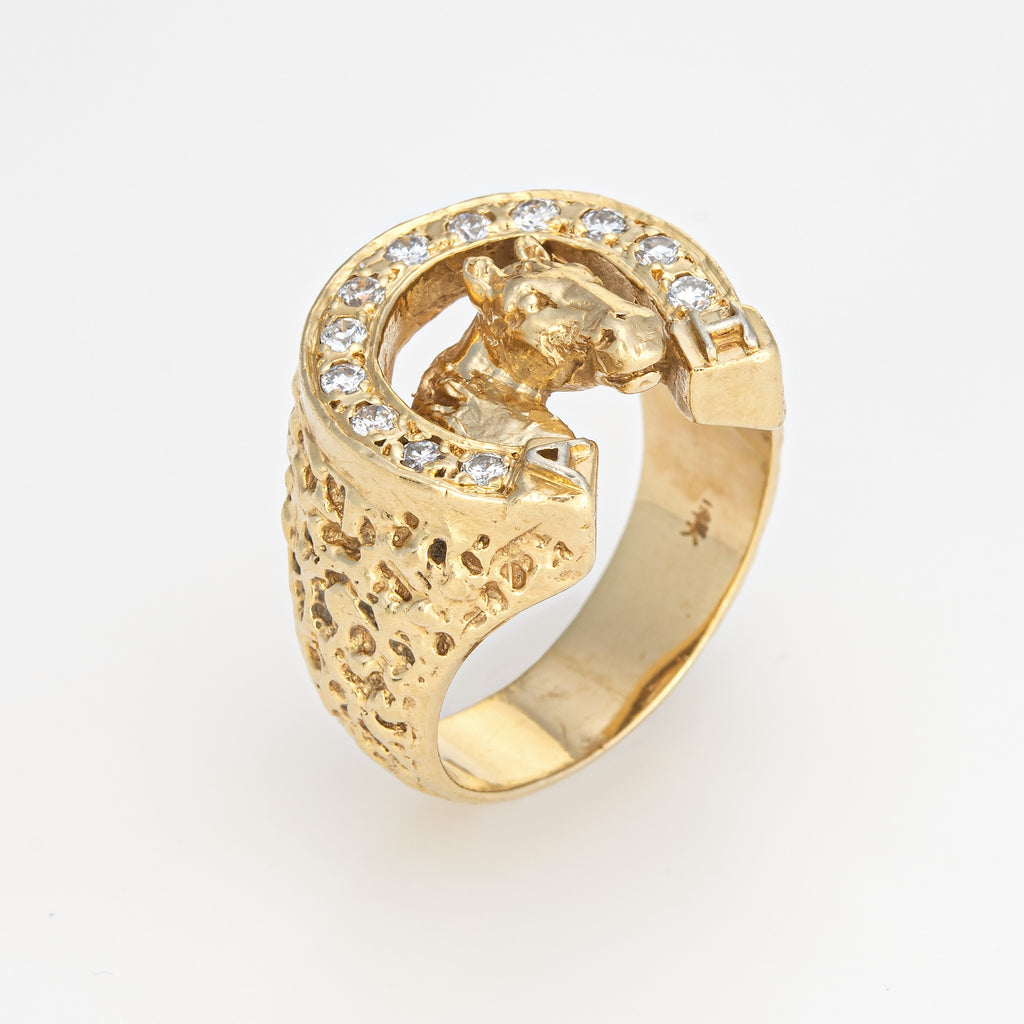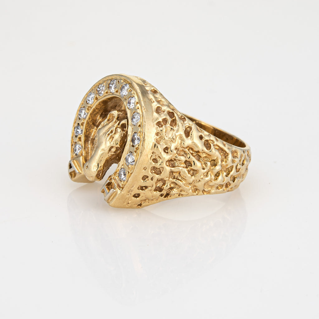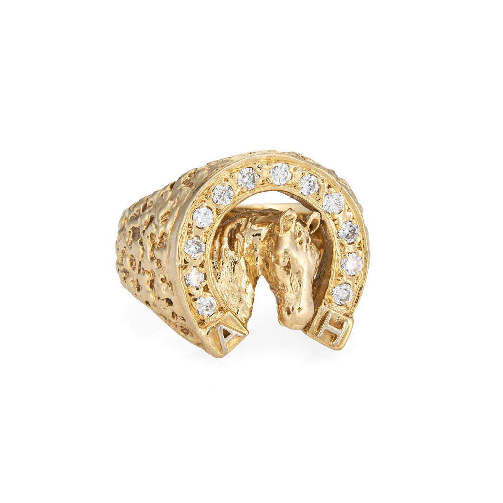 The charming horseshoe motif symbolizes good luck, with a horse head to the center highlighting the majestic animal. The side shoulders feature a nugget finish, a popular style in 70s jewelry and a testament to the aesthetic style of the era. The ring has a hefty feel 19.2 grams and makes a weighty presence on the hand. Originally designed as a men's ring the ring looks great on a woman's hand too. The low rise ring (5mm - 0.19 inches) sits comfortably on the finger.