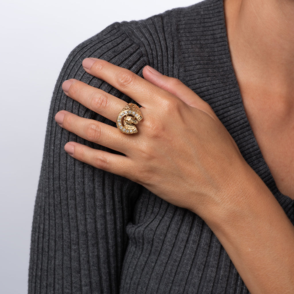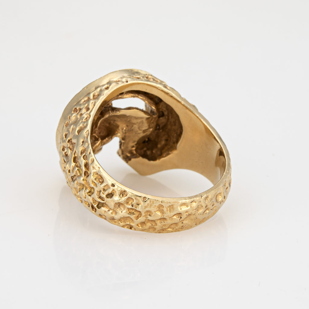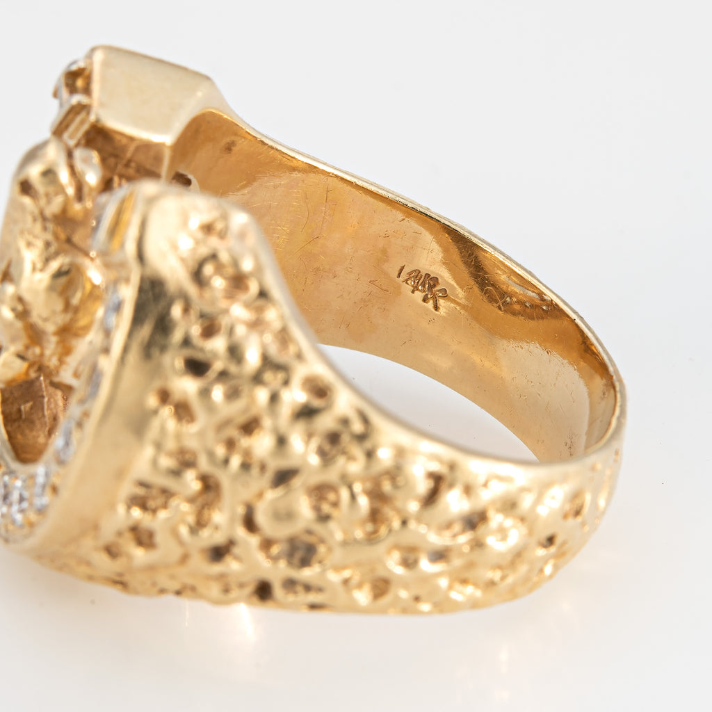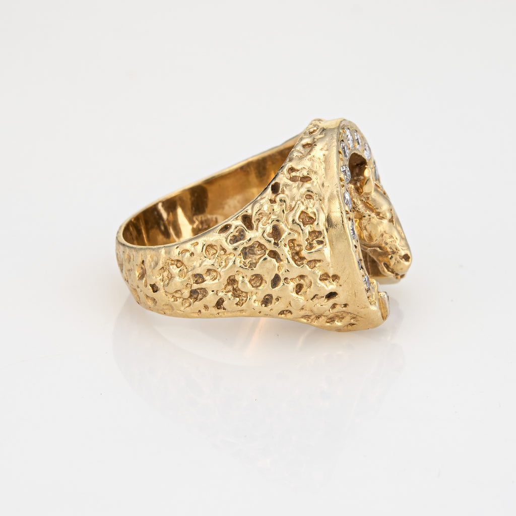 The charming horseshoe motif symbolizes good luck, with a horse head to the center highlighting the majestic animal. The side shoulders feature a nugget finish, a popular style in 70s jewelry and a testament to the aesthetic style of the era. The ring has a hefty feel 19.2 grams and makes a weighty presence on the hand. Originally designed as a men's ring the ring looks great on a woman's hand too. The low rise ring (5mm - 0.19 inches) sits comfortably on the finger.