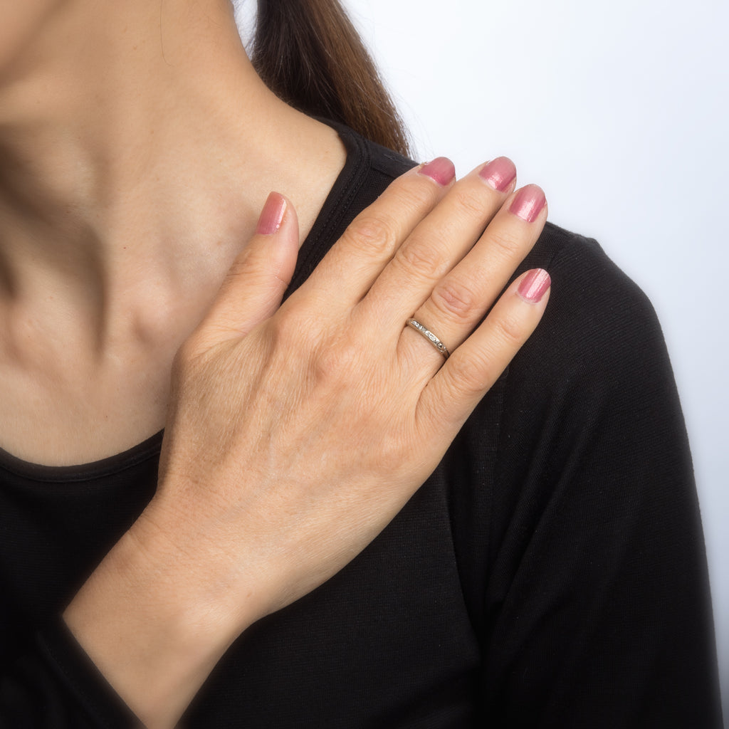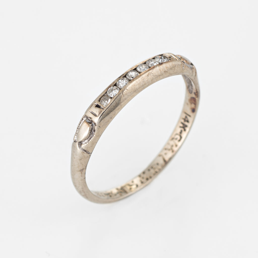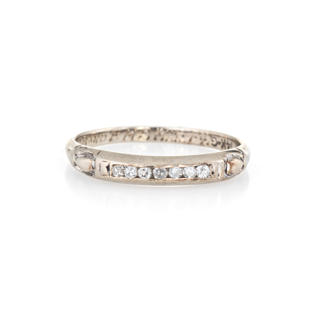 Elegant vintage diamond wedding band (circa 1941) crafted in 14 karat white gold.