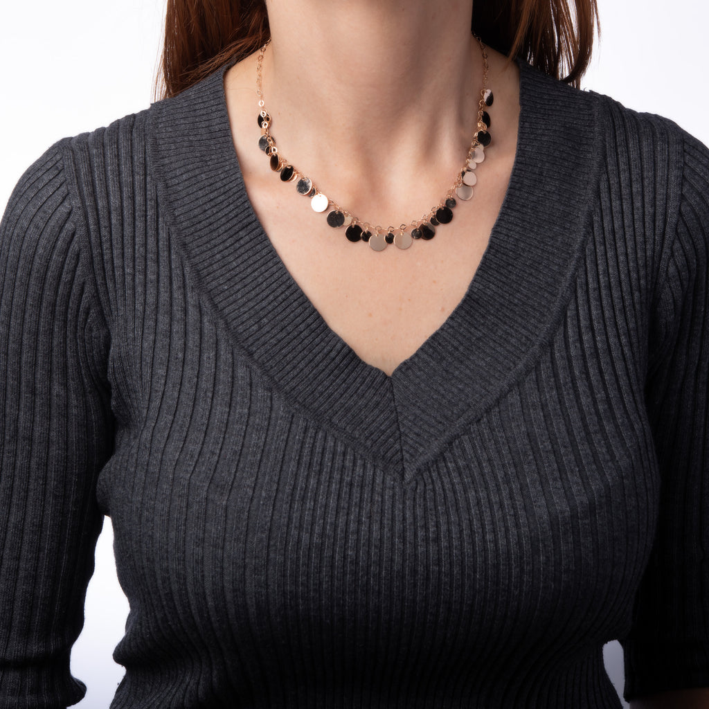 The stylish necklace features round discs suspended from the chain. The discs move freely and catch light for a beautiful shimmery effect. The necklace has a lightweight feel and is great worn alone or layered with your fine jewelry from any era.