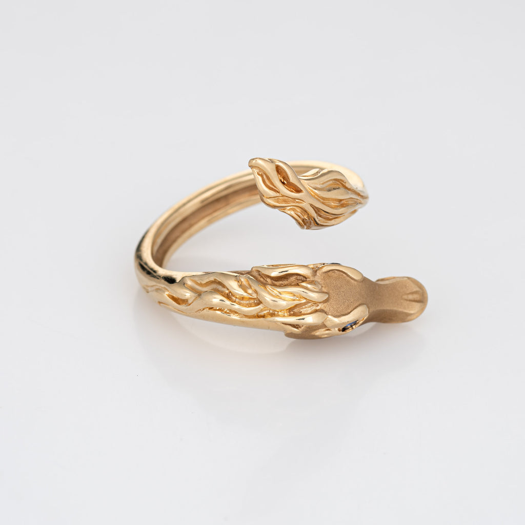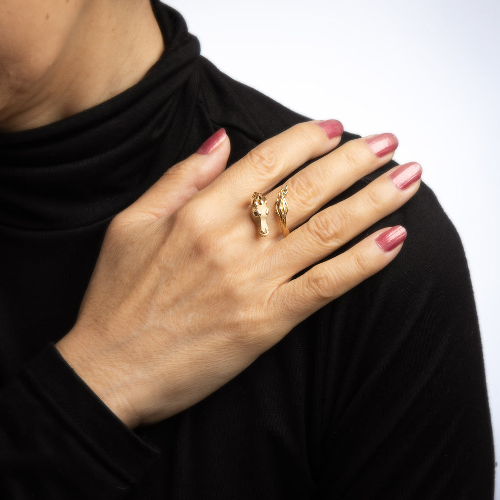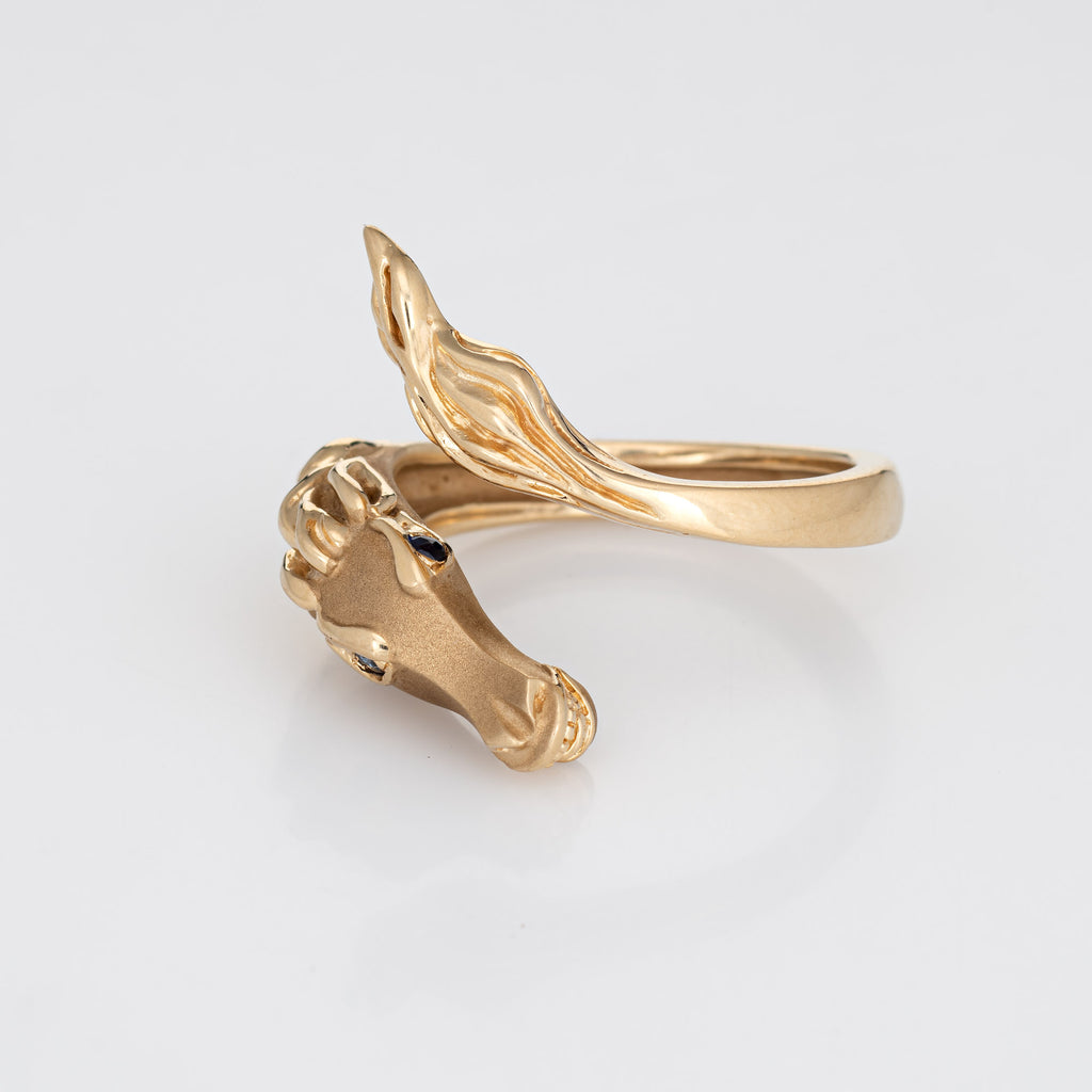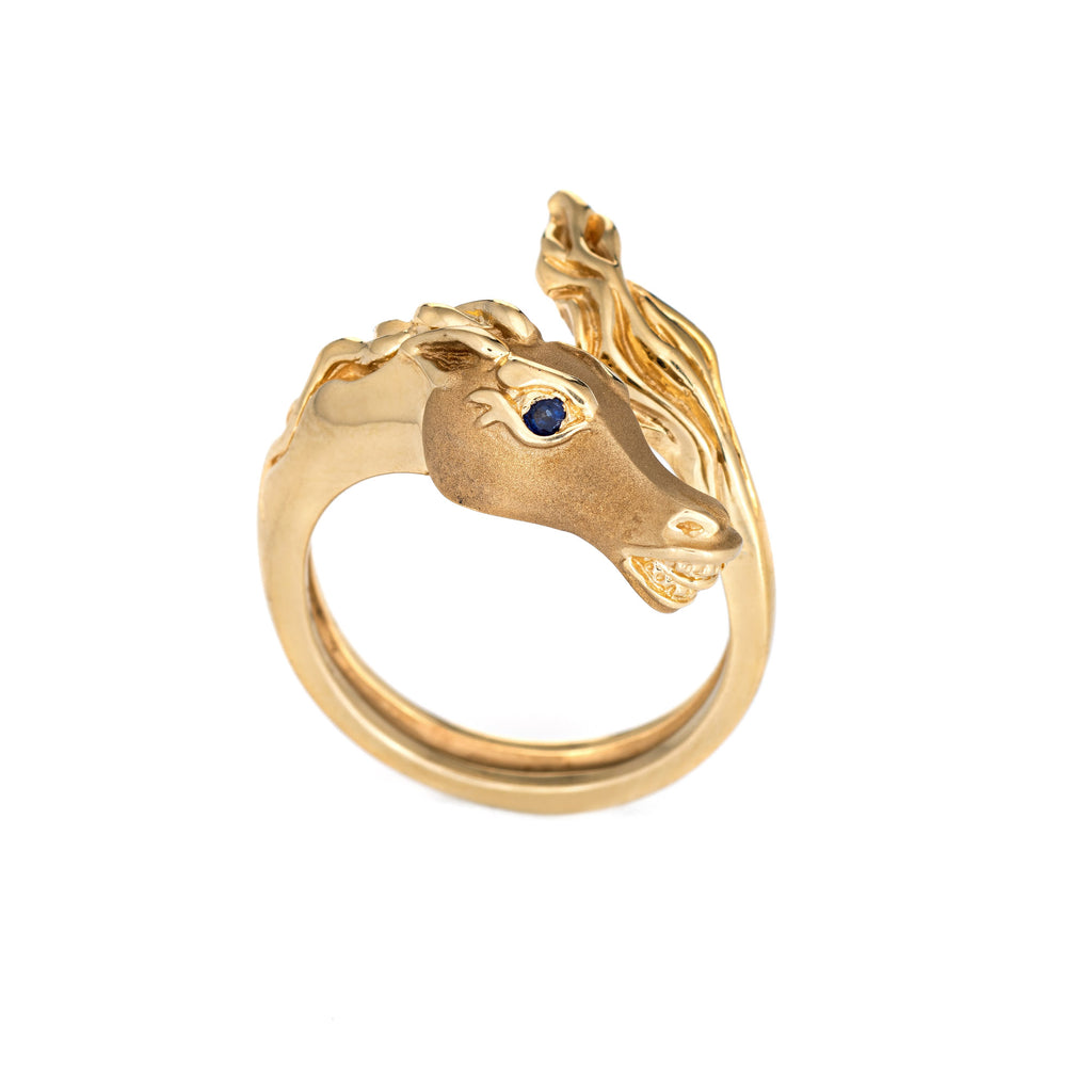 The horse features a satin finish to the face with sapphire set eyes and a flowing mane. The tail wraps around the finger and the ring sits comfortably on the finger. The ring has a low rise (6mm - 0.23 inches).