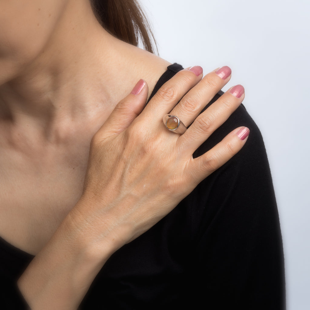 The natural opal shows a nice play of colors with a strong orange and green base with bits of purple, yellow and red. Designed as a men's signet ring the ring also looks great on a woman's hand.