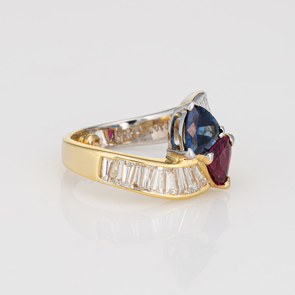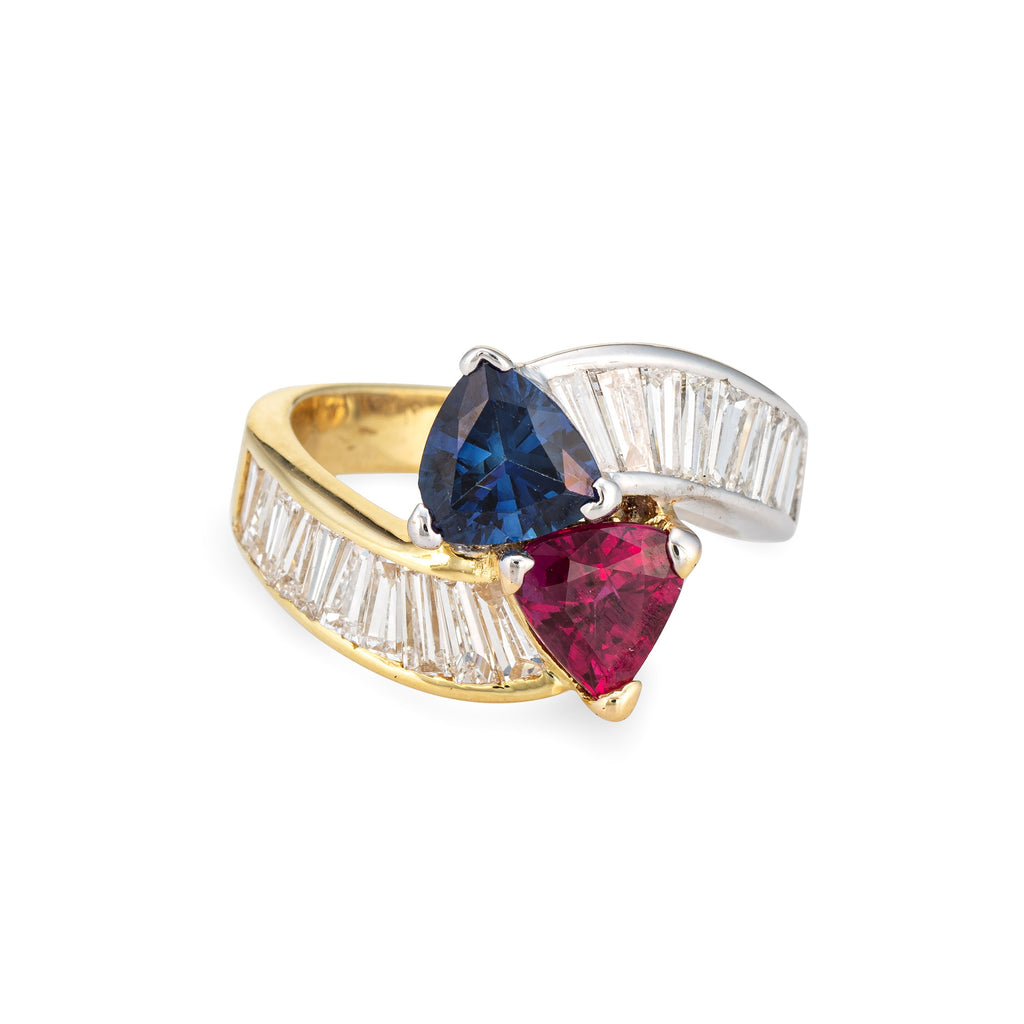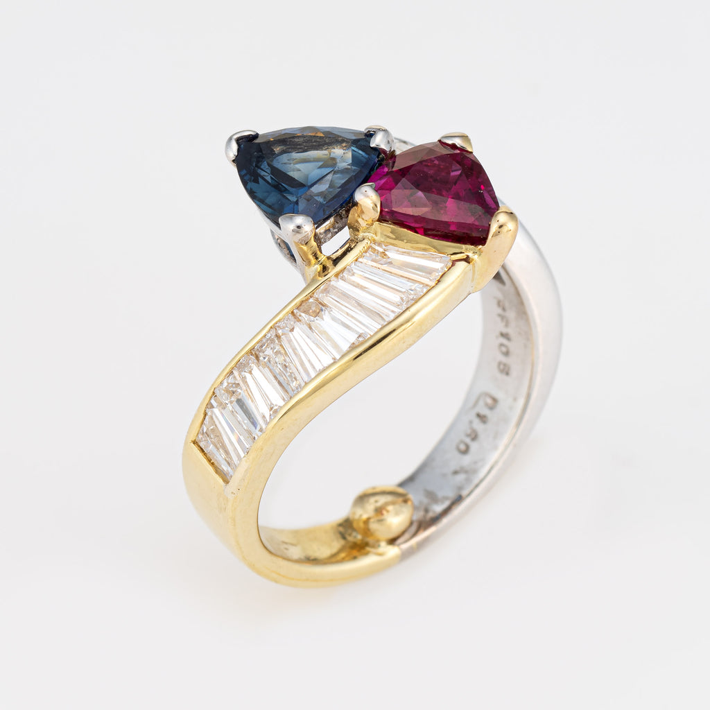 Finely detailed vintage natural ruby & sapphire 'moi et toi' ring crafted in 18k yellow & white gold (circa 1980s to 1990s).