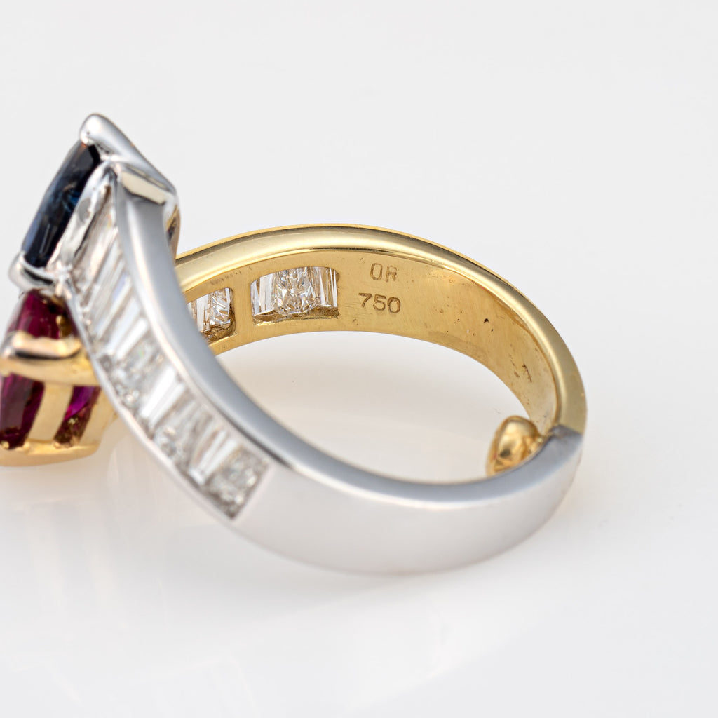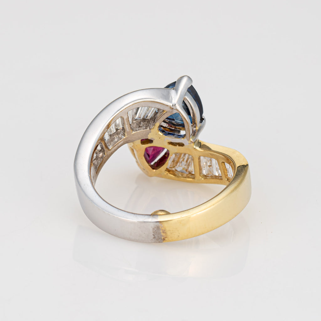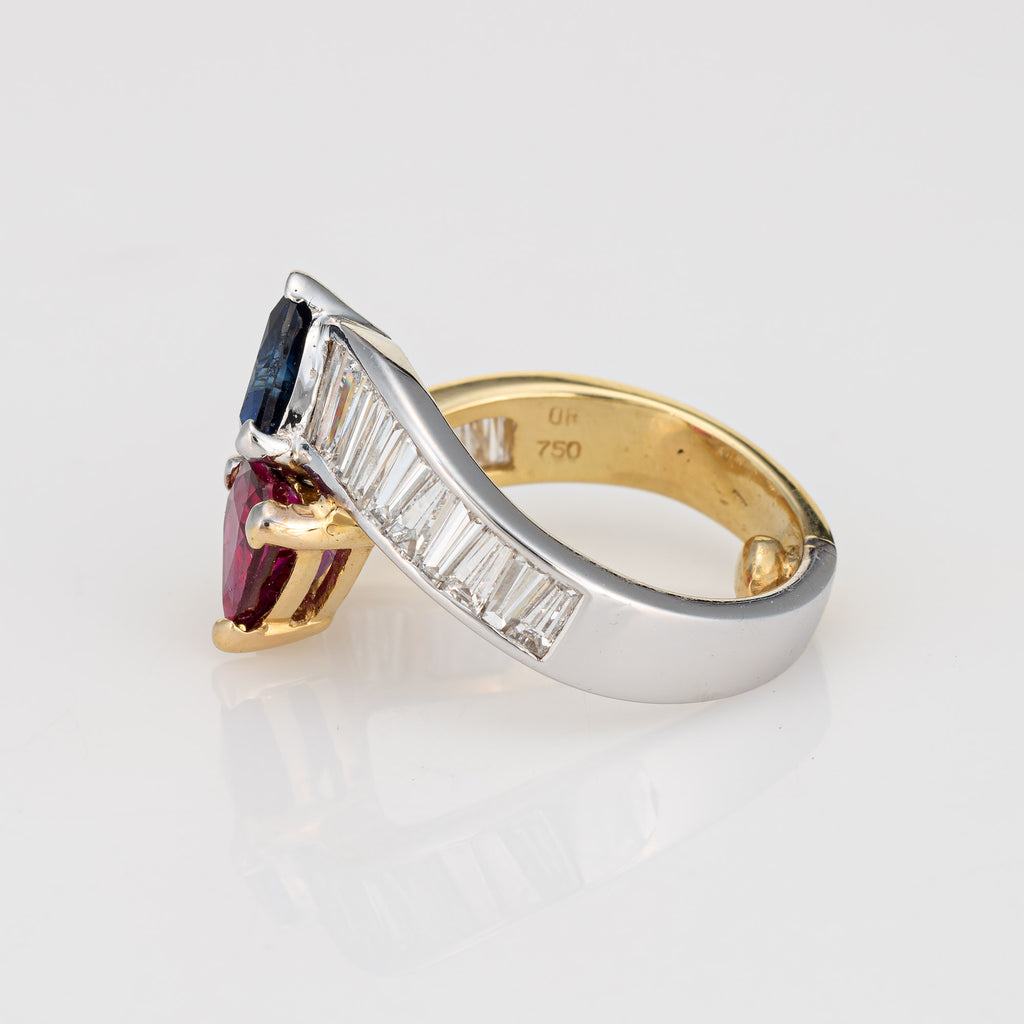Finely detailed vintage natural ruby & sapphire 'moi et toi' ring crafted in 18k yellow & white gold (circa 1980s to 1990s).