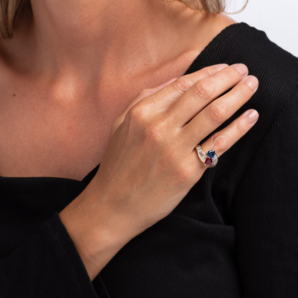 The distinct and stylish ring is great worn as a right hand ring or would make a unique choice as an engagement ring. The two stone ruby & sapphire 'Moi et Toi' design is a French term for "Me and You". The mount has a slightly curved dome for a comfortable fit on the finger. The ring has a low profile and rises 6mm from the finger (0.23 inches).