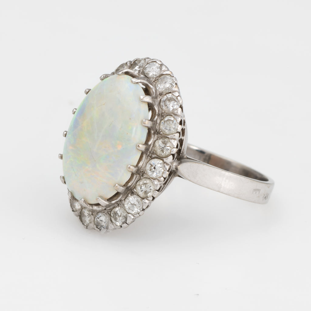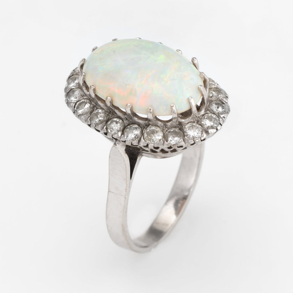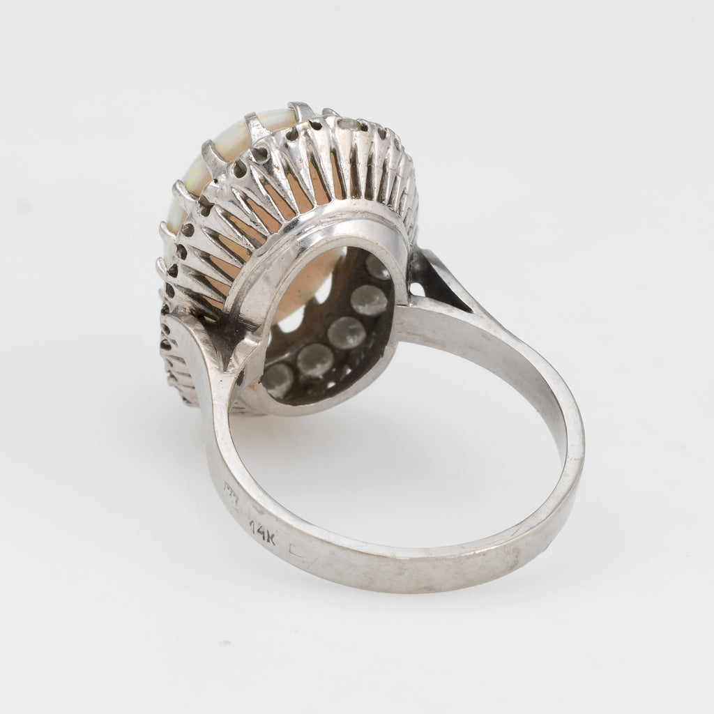 Finely detailed vintage opal & diamond cocktail ring (circa 1950s to 1960s), crafted in 14 karat white gold.