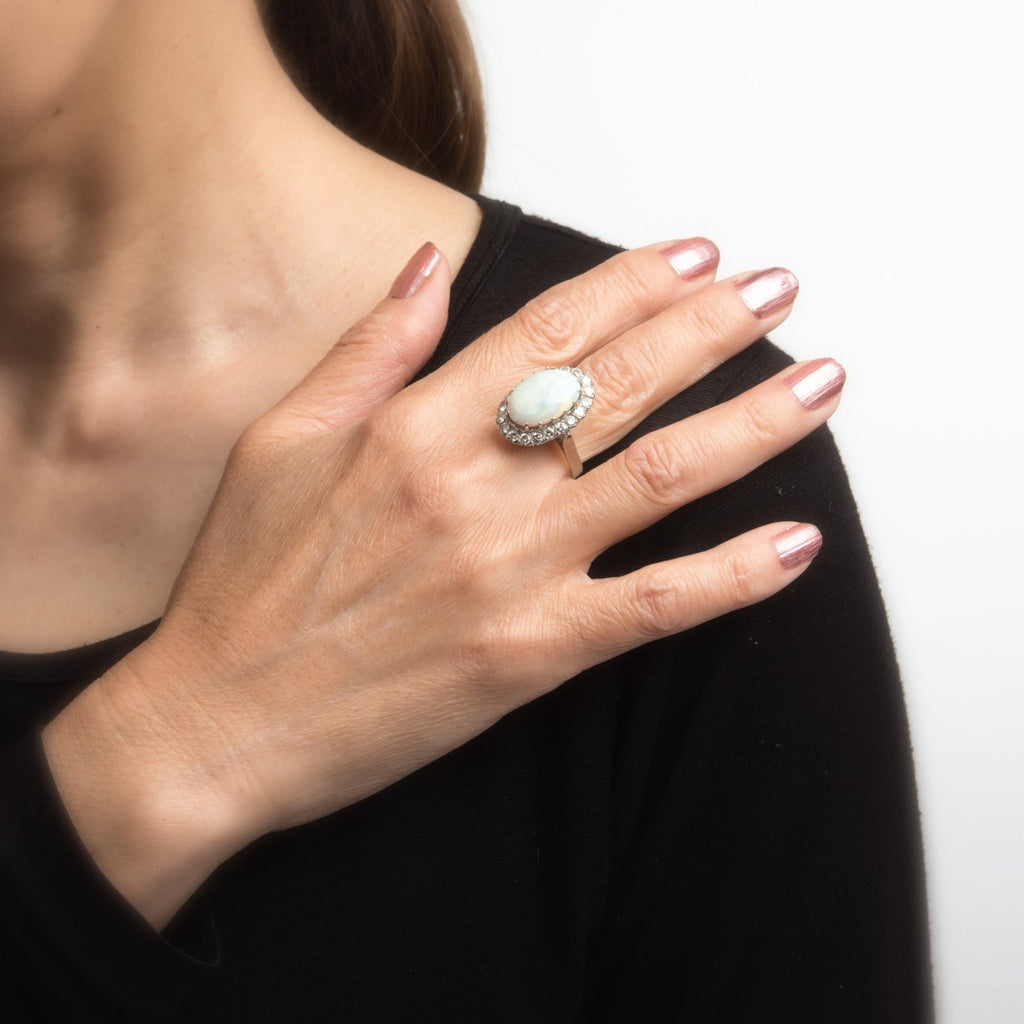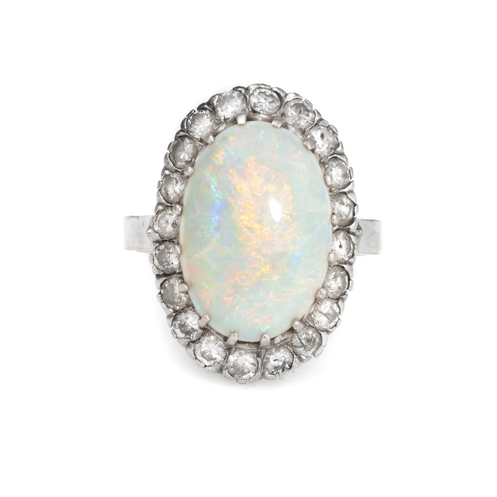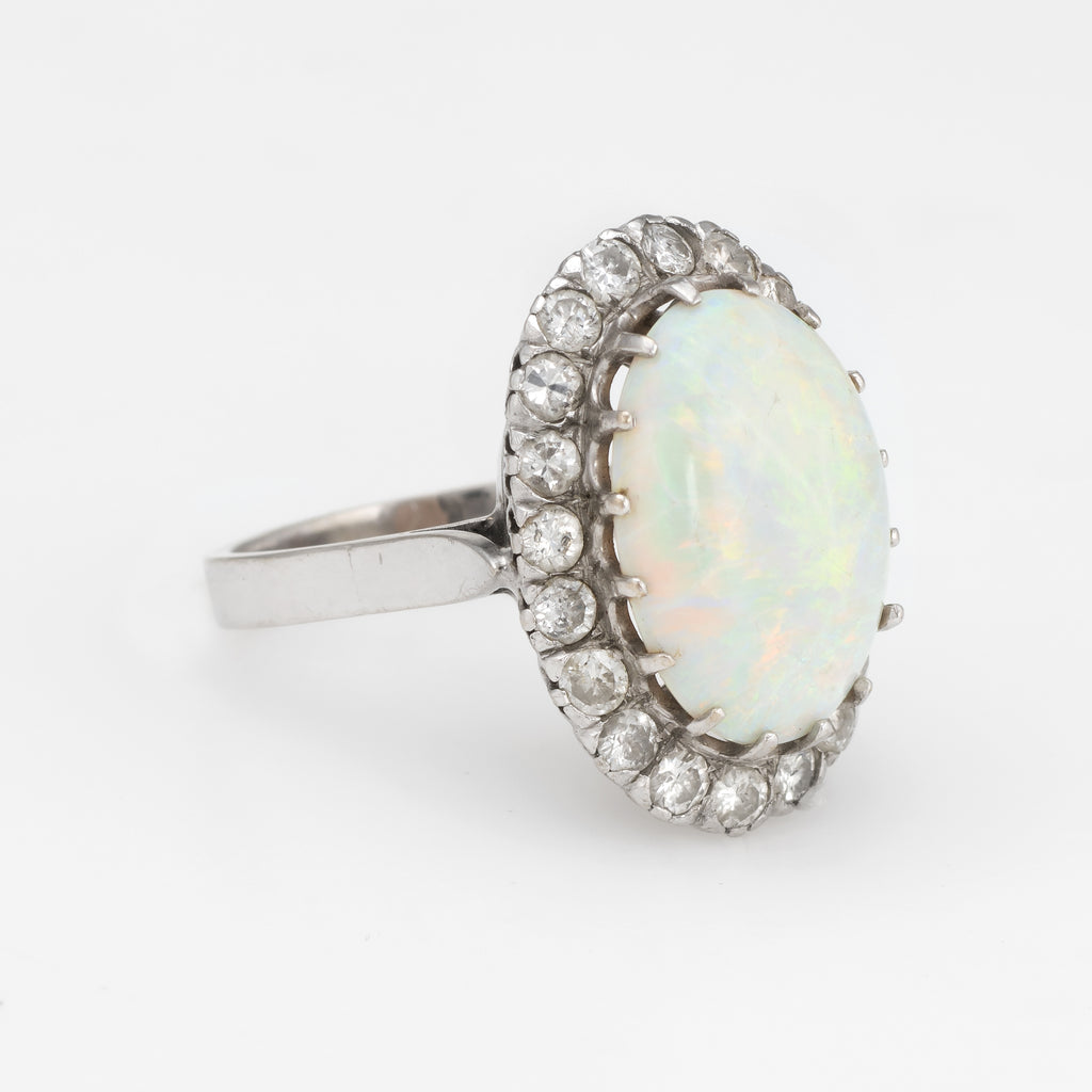 Finely detailed vintage opal & diamond cocktail ring (circa 1950s to 1960s), crafted in 14 karat white gold.