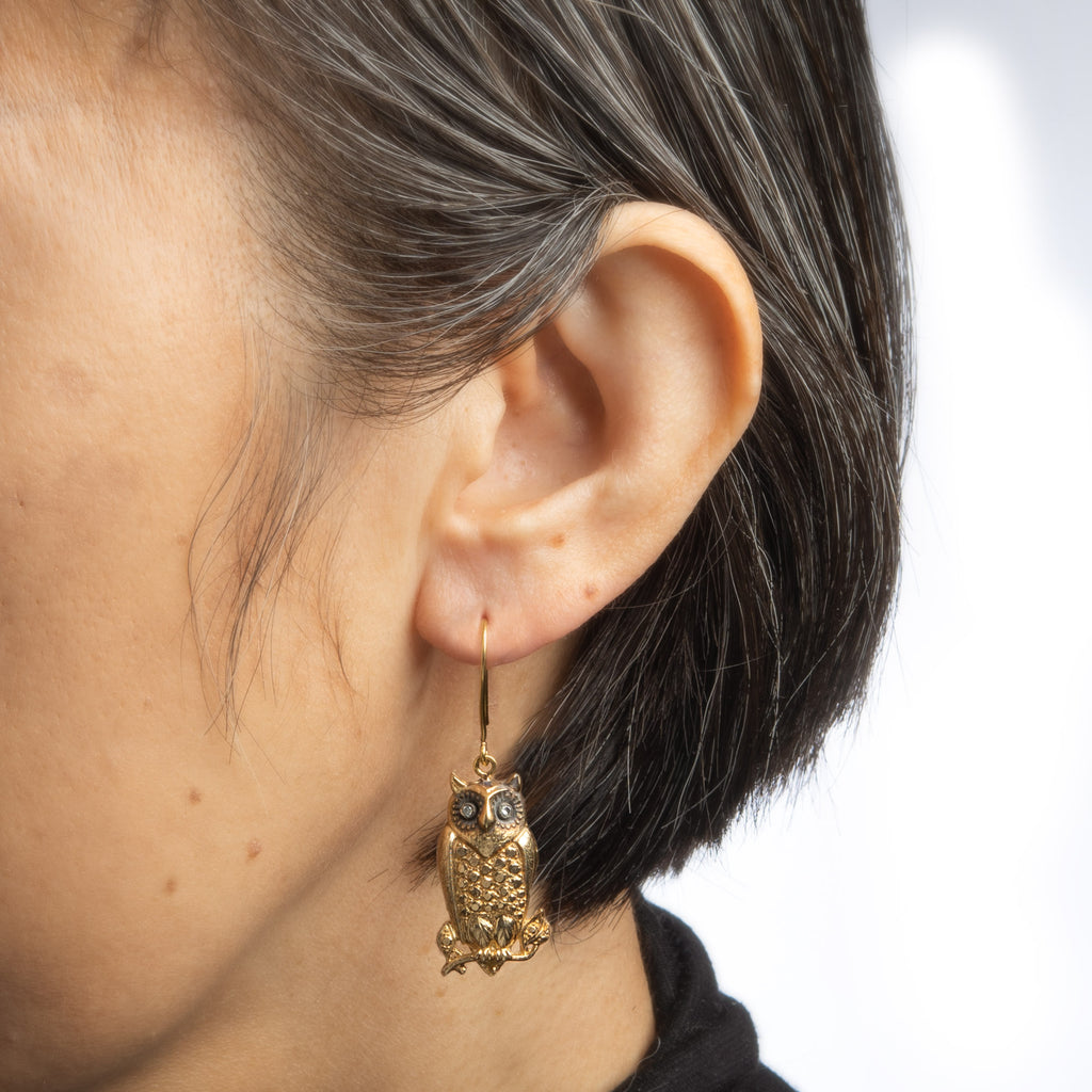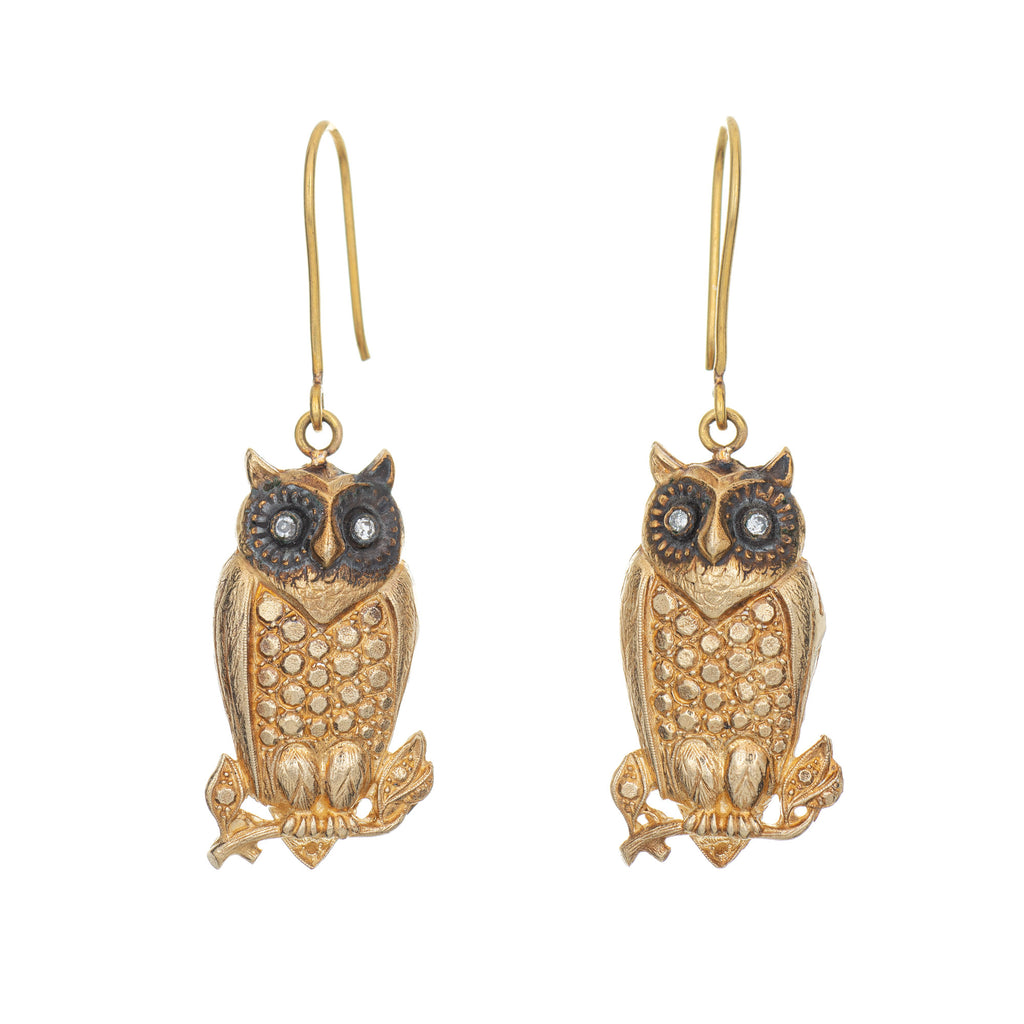 The charming earrings feature two owls perched on a branch. The owls are nicely detailed with a feather like design to the belly and haunting diamond set eyes. The earrings are fitted with hook backings for pierced ears.