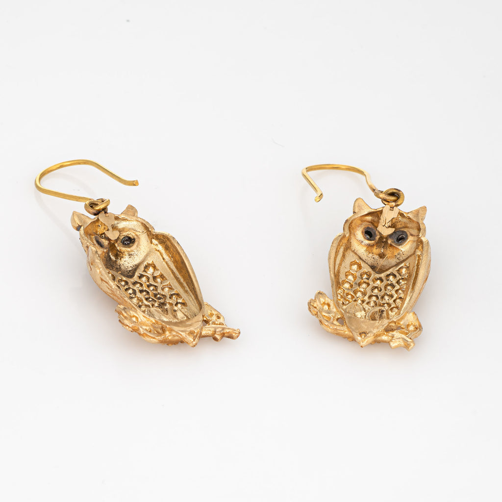Distinct and stylish pair of diamond owl drop earrings crafted in 14k yellow gold (circa 1960s to 1970s).