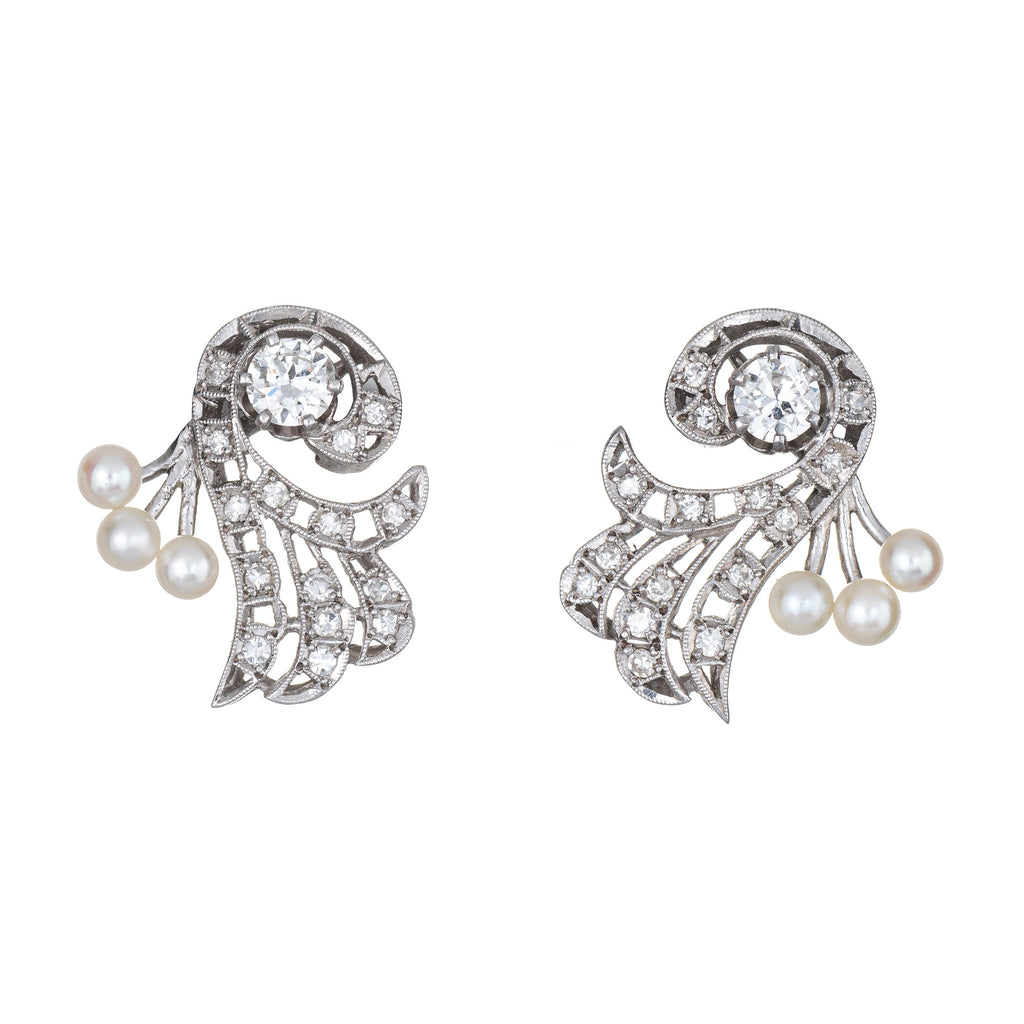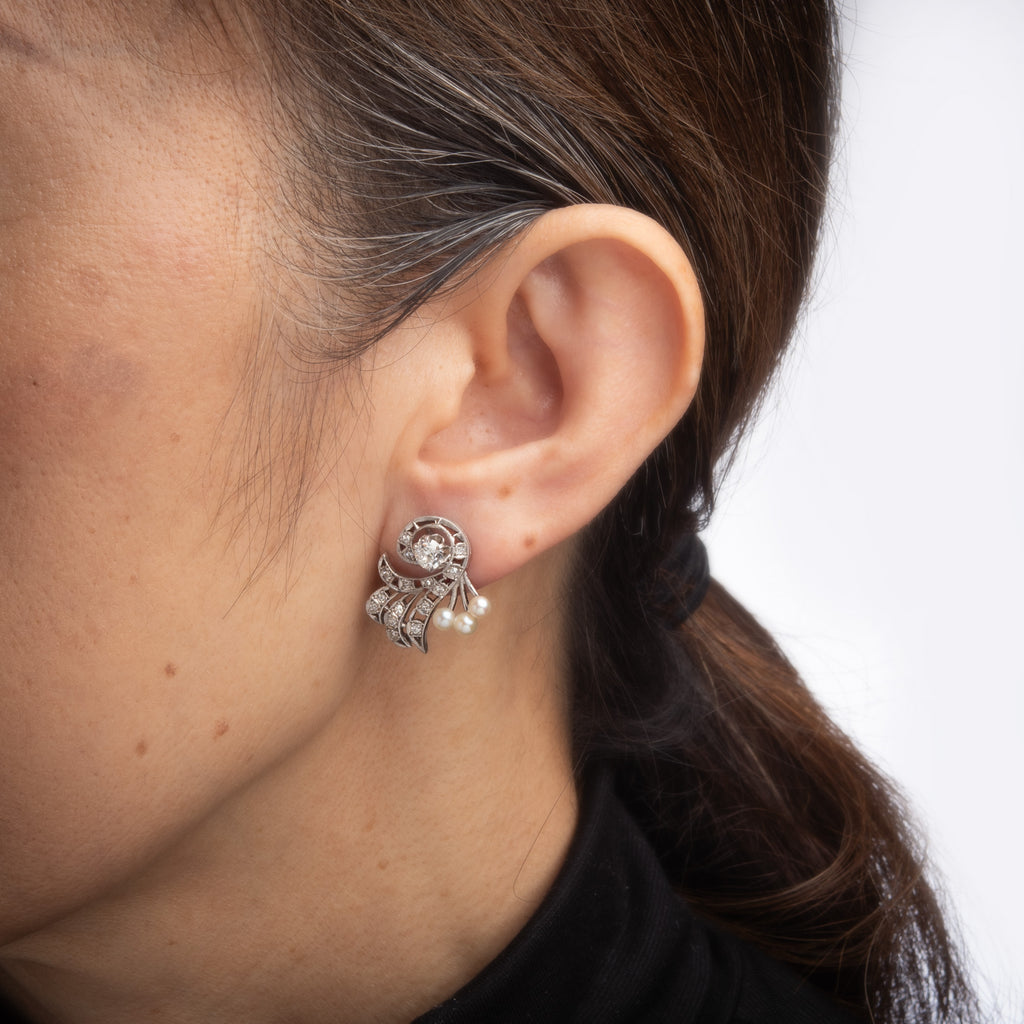Elegant pair of vintage platinum diamond & cultured pearl earrings (circa 1940s to 1950s) crafted in 900 platinum.