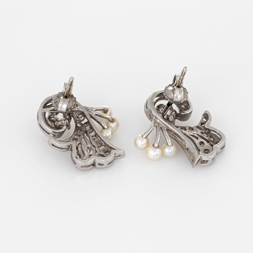 Vintage Platinum Diamond Pearl Spray Earrings Mid Century Estate Fine Jewelry