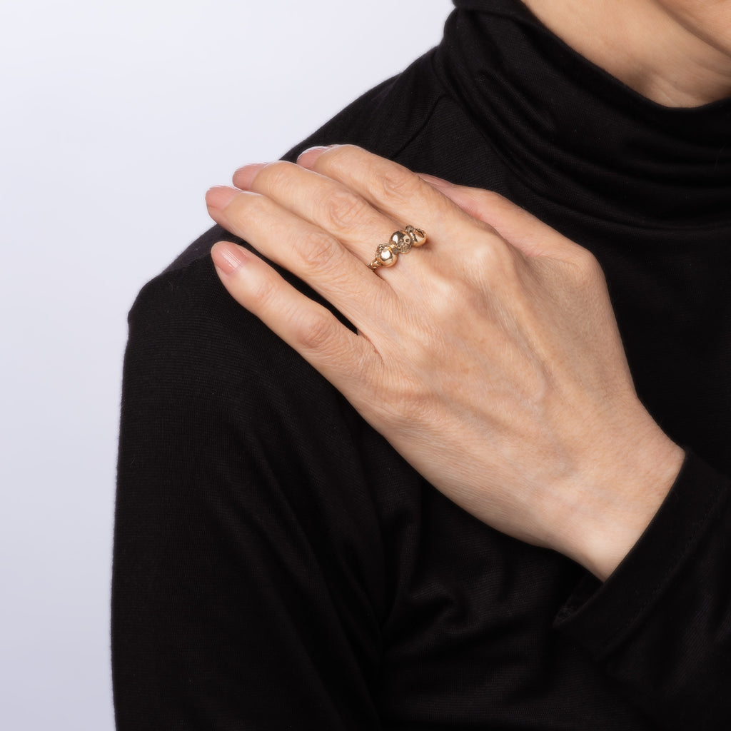 Three skull heads with the center set in opposing form adorn the band. The ring is great worn alone or stacked with your fine jewelry from any era.