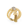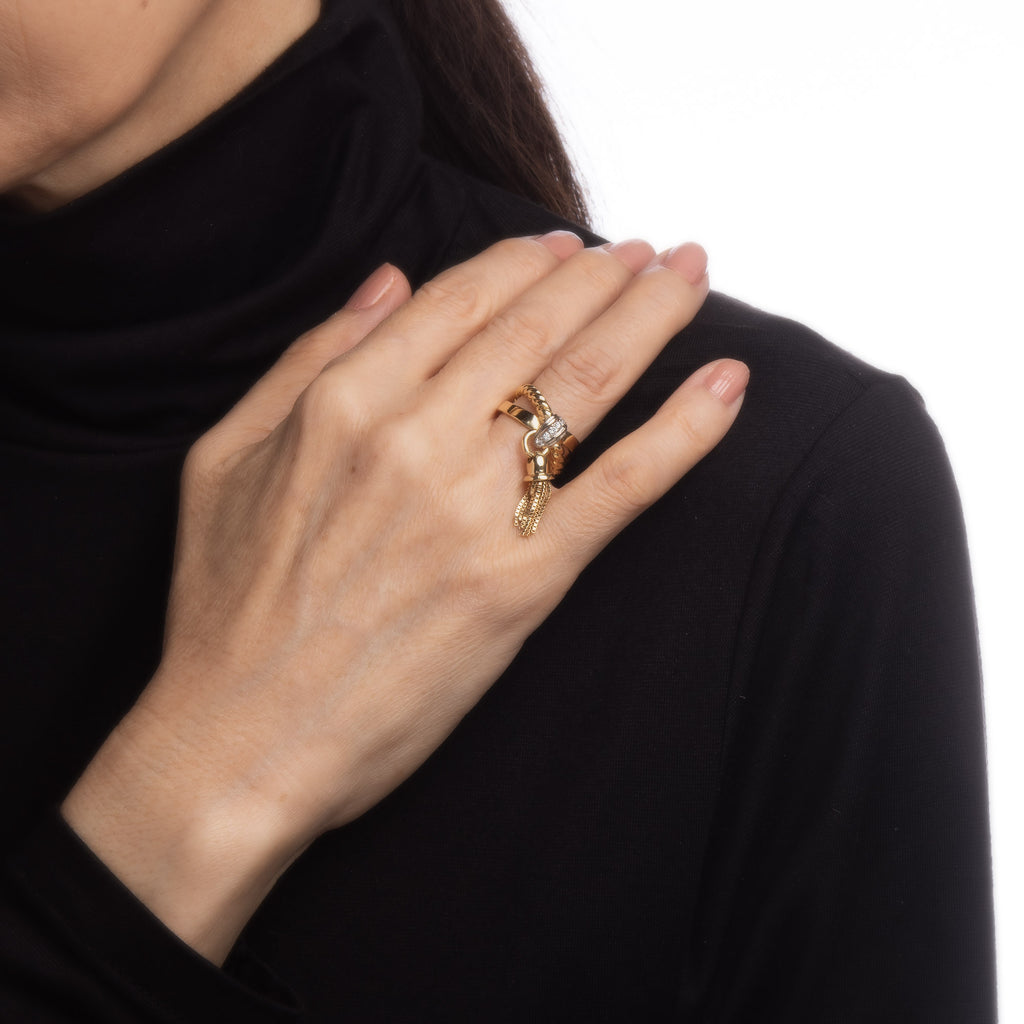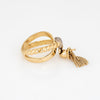 The tassel is hinged to the diamond set mount, allowing for movement on the finger. The split shank band, with a twist and high polish finish, is great worn alone or layered with your fine jewelry from any era. The low rise band (5mm - 0.19 inches) sits comfortably on the finger.