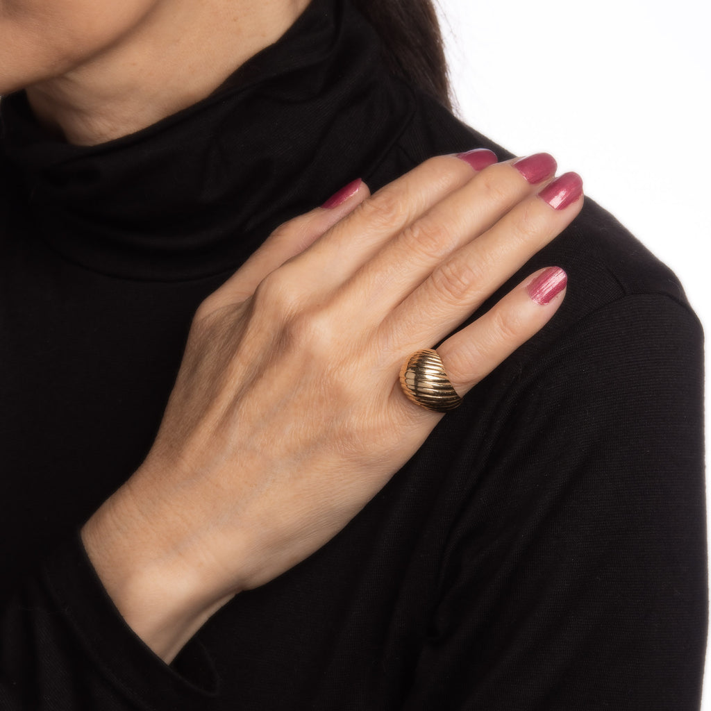 The mid century domed ring features an off-center textured ribbed design. The mid-rise dome rises 6.5mm from the finger (0.25 inches). Currently a size 4 1/2 (can be resized) the ring is great worn on the pinky finger.